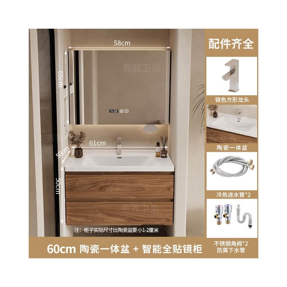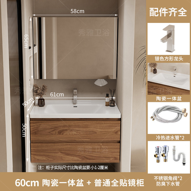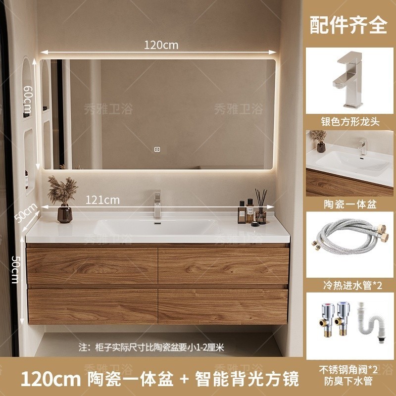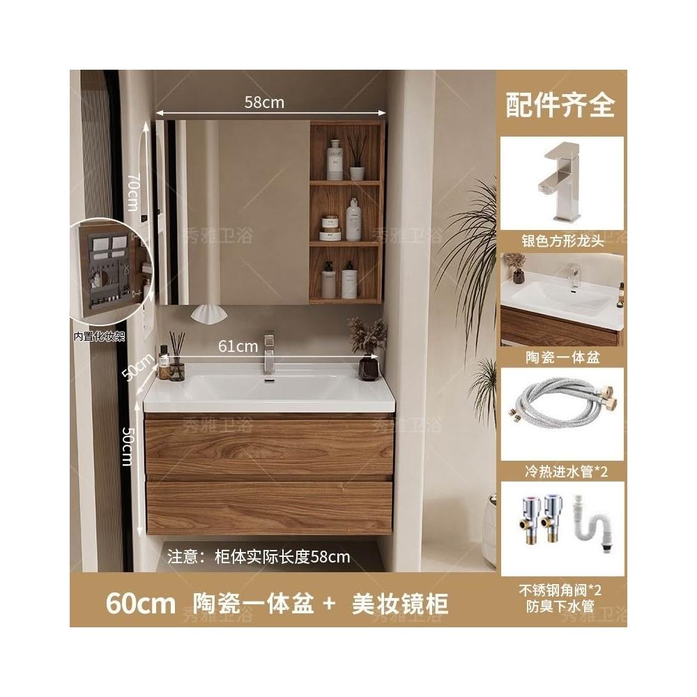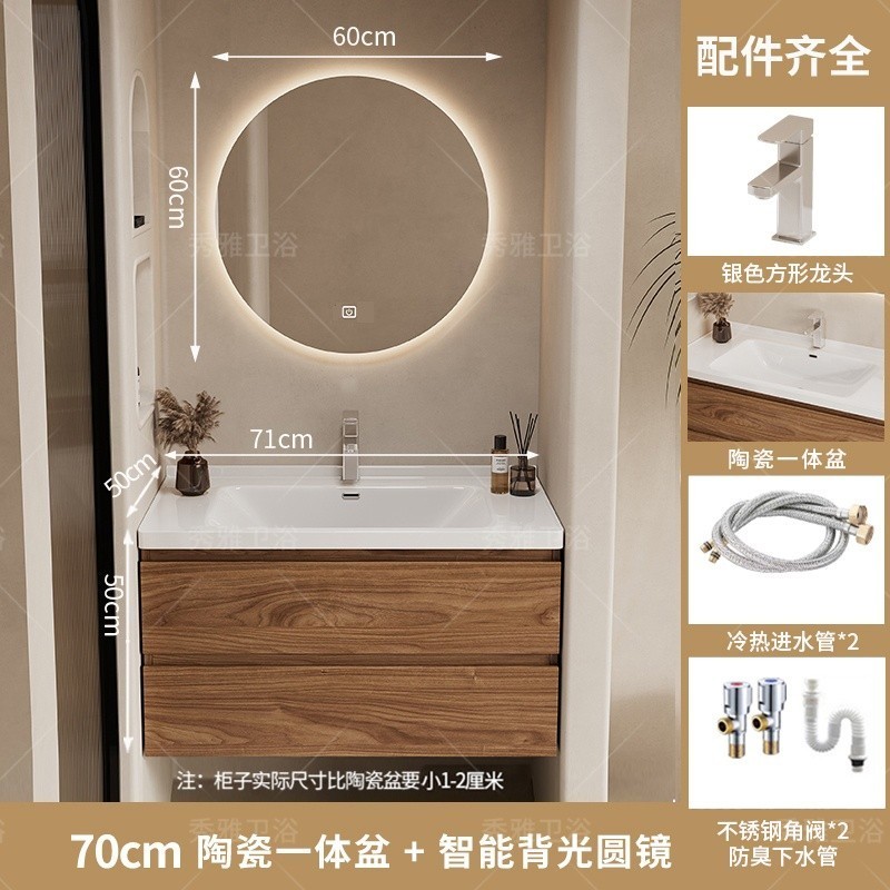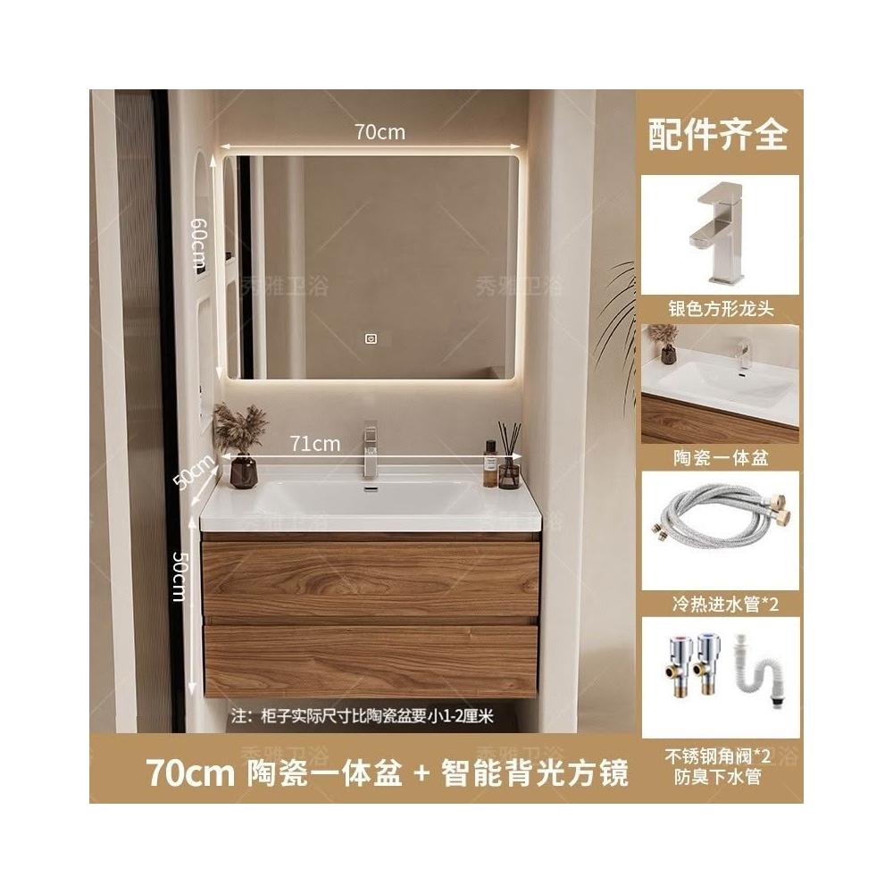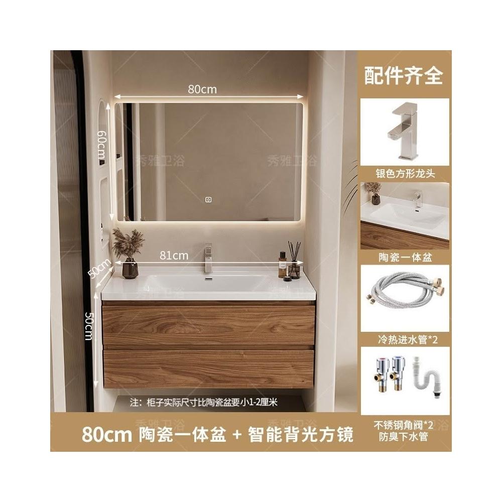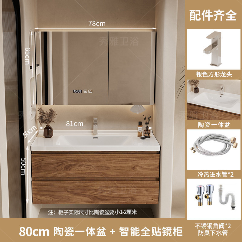 安安家具黑胡桃木色浴室櫃 陶瓷一體盆浴櫃 衛生間洗漱臺 現代簡約洗手臺 鏡櫃組合 防潮實木 多功能收納