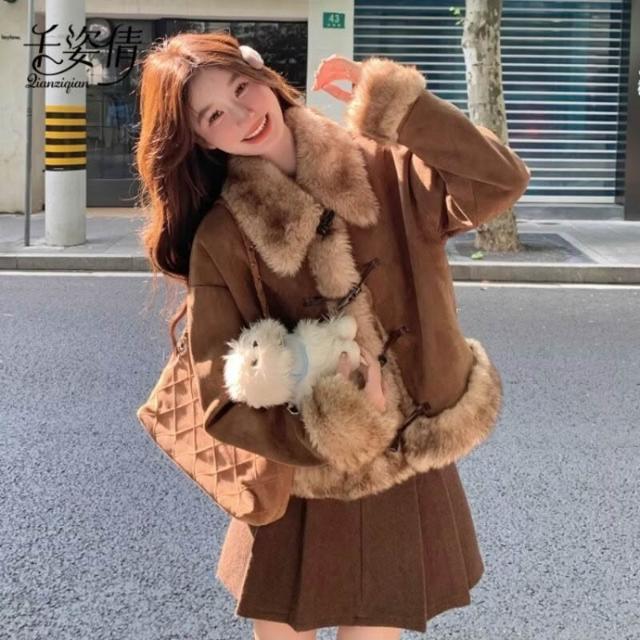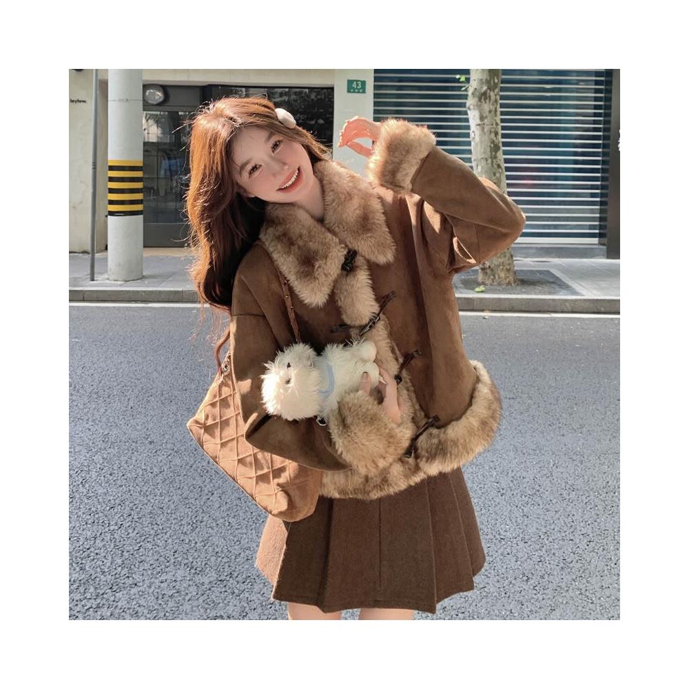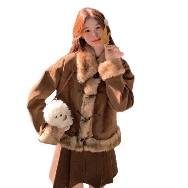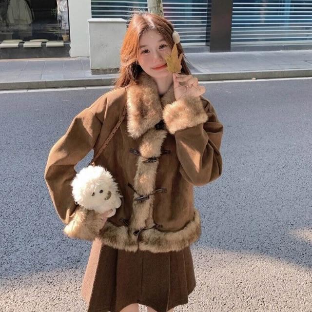 絮語衣社 秋冬季美式毛領麂皮絨羊羔毛外套女短款寬松牛角扣毛毛保暖外套女