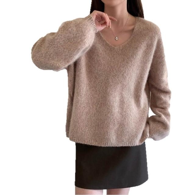 全臺热销🔥 濮院秋冬新款V領駝色羊毛衫拉毛女寬松打底針織衫毛衣 (針織衫/女上衣/針織上衣/長袖上衣/長袖針織衫)