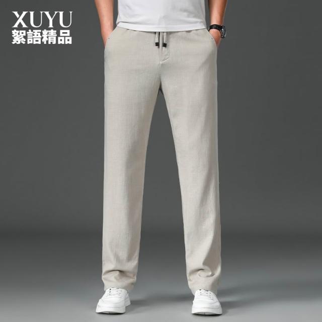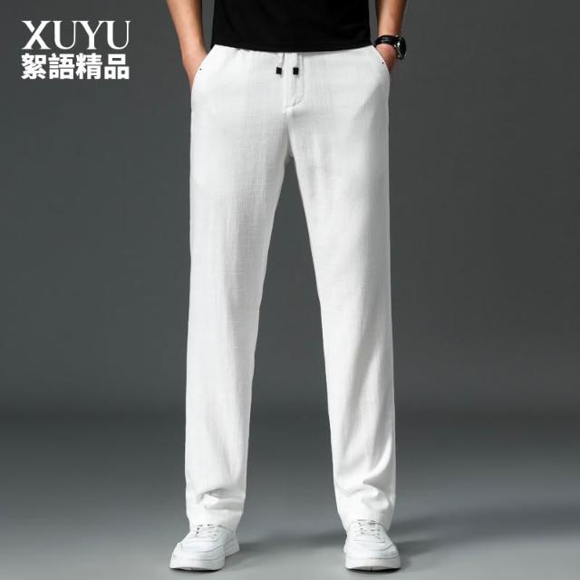商務休閒褲 西裝褲 商務長褲 男長褲 春夏薄款高端白色亞麻休閑褲男寬松直筒松緊彈力棉麻透氣運動長褲