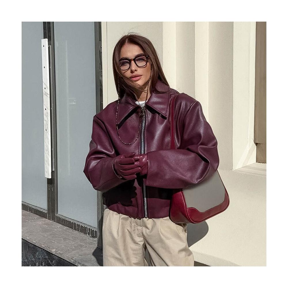 絮語精品熱銷🔥🔥 復古機車風酒紅色皮衣女秋季歐美時髦啞光皮夾克外套女裝 (皮衣外套 皮夾克外套 皮外套 時尚皮夾克外套)