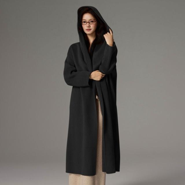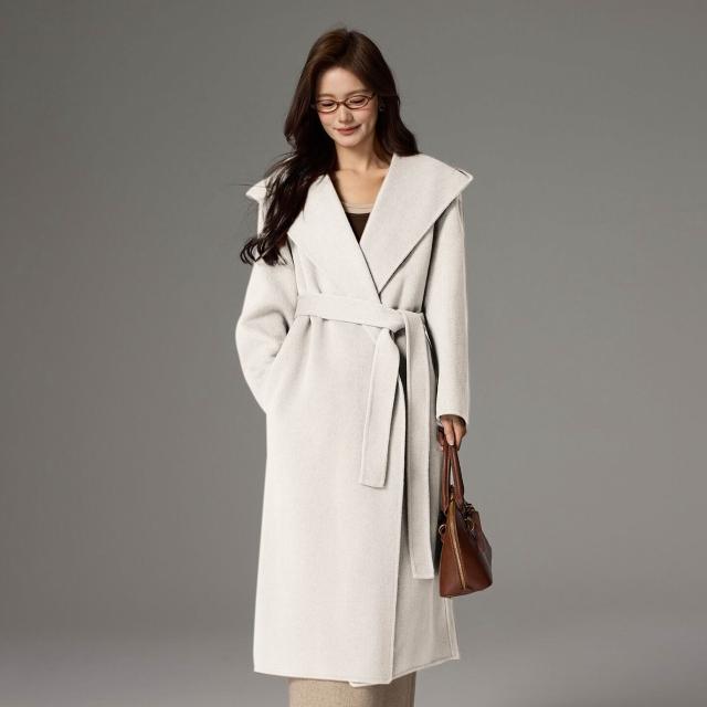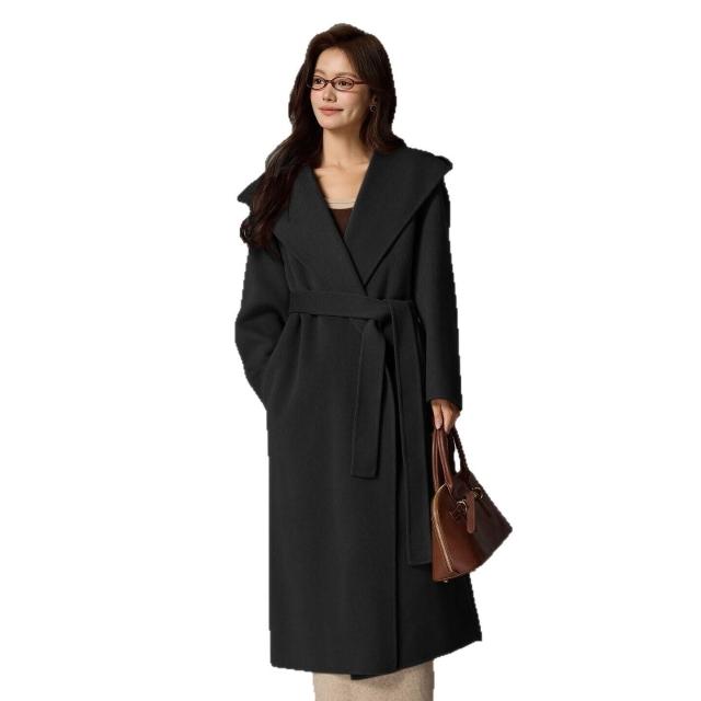 爆款🔥🔥 秋冬新款羊絨浴袍款雙面呢羊毛大衣女寬松系帶連帽羊毛呢子外套 (高級大衣 高級中長款大衣 羊絨寬鬆大衣 羊絨寬鬆外套)