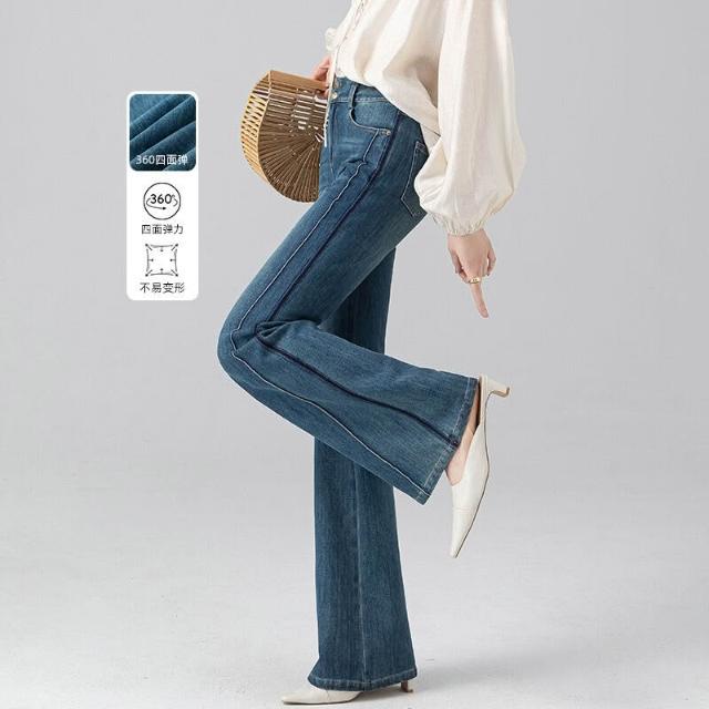 熱銷🔥 彈力梨形身材顯瘦褲子女秋季新款高腰雙排扣微喇牛仔褲 (女長褲 阔腿裤 百搭休閒長褲)