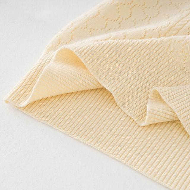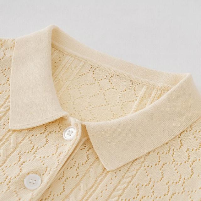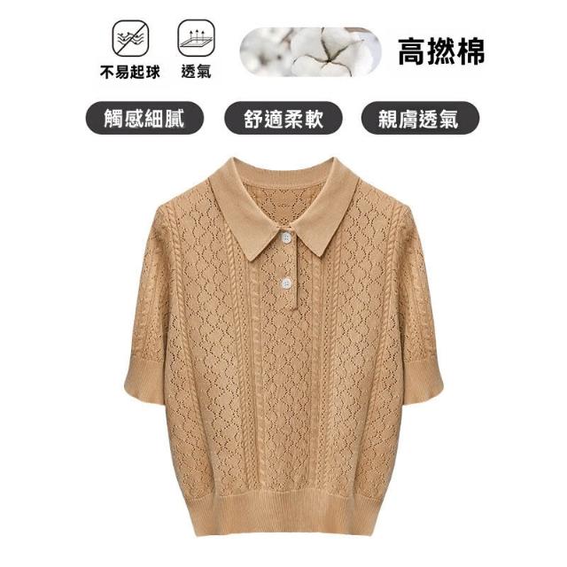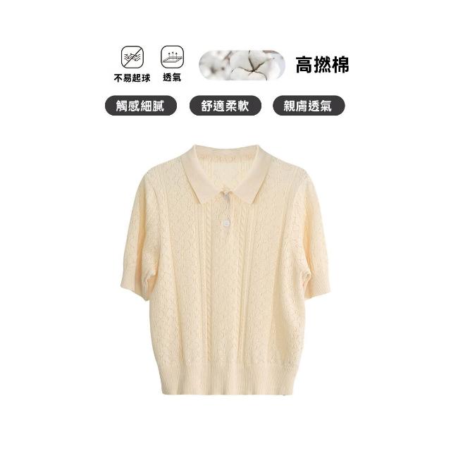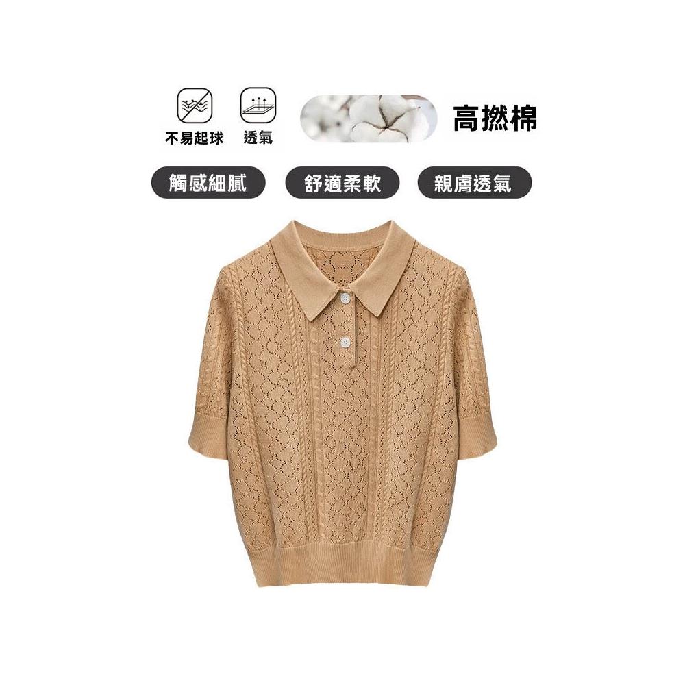 熱銷🔥🔥 镂空絞花polo領針織衫女夏薄款100%棉落肩短袖法式上衣 (輕薄針織衫 時尚女裝上衣 針織上衣 精緻上衣)