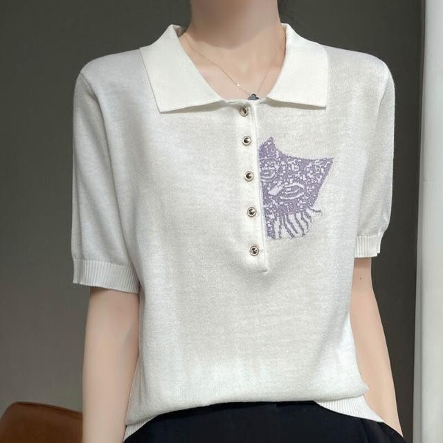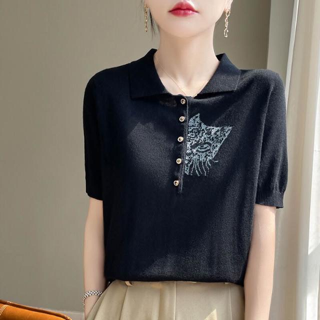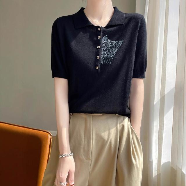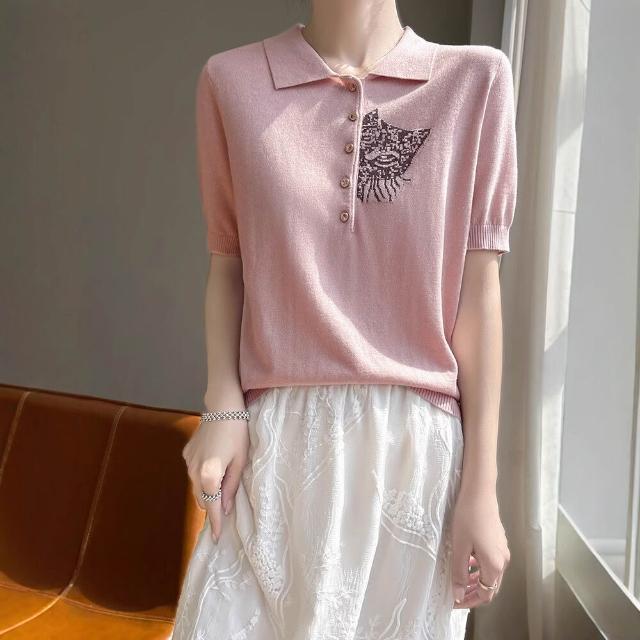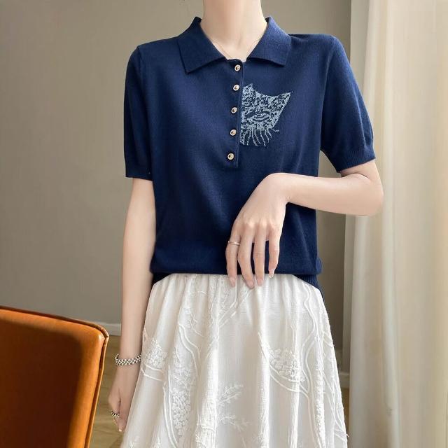 熱銷🔥🔥 夏新款精紡桑蠶絲羊毛針織短袖T恤女POLO領貓咪刺繡薄款上衣半袖 (輕薄針織衫 時尚女裝上衣 針織上衣 精緻上衣)