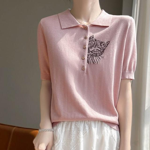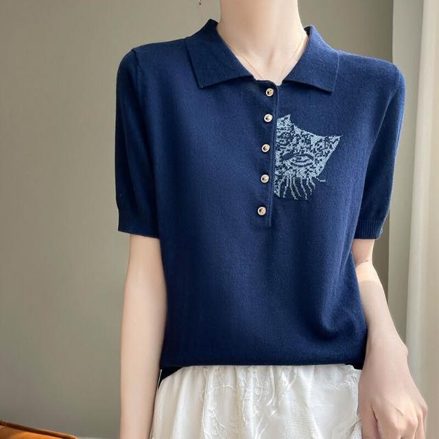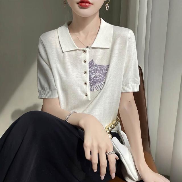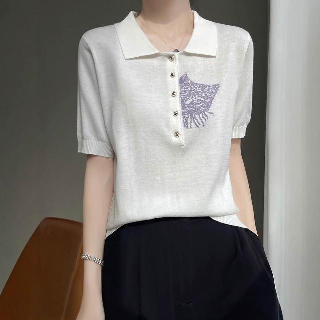 熱銷🔥🔥 夏新款精紡桑蠶絲羊毛針織短袖T恤女POLO領貓咪刺繡薄款上衣半袖 (輕薄針織衫 時尚女裝上衣 針織上衣 精緻上衣)