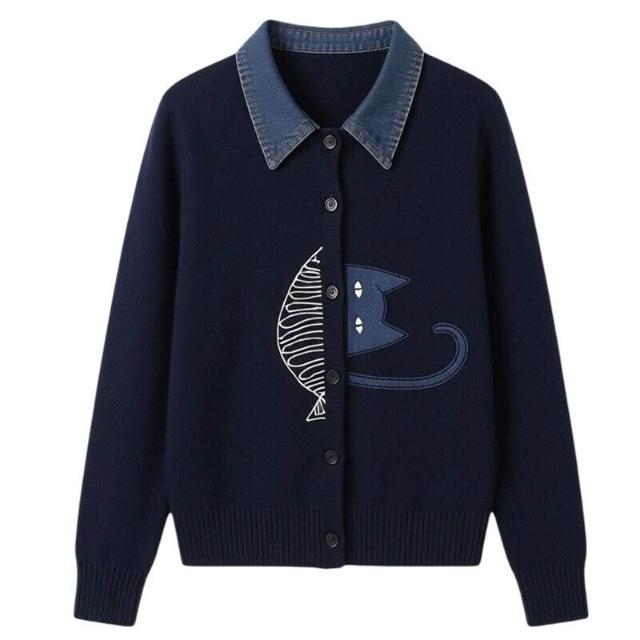 絮語精品熱銷🔥🔥 假兩件牛仔拼接翻領針織開衫女春薄款設計感刺繡減齡短毛衣外套 (輕薄針織衫 時尚女裝上衣 針織上衣 精緻上衣)