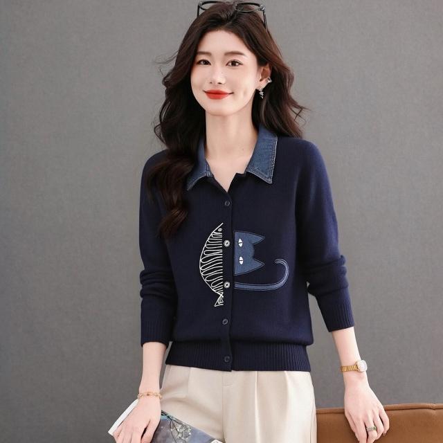 絮語精品熱銷🔥🔥 假兩件牛仔拼接翻領針織開衫女春薄款設計感刺繡減齡短毛衣外套 (輕薄針織衫 時尚女裝上衣 針織上衣 精緻上衣)