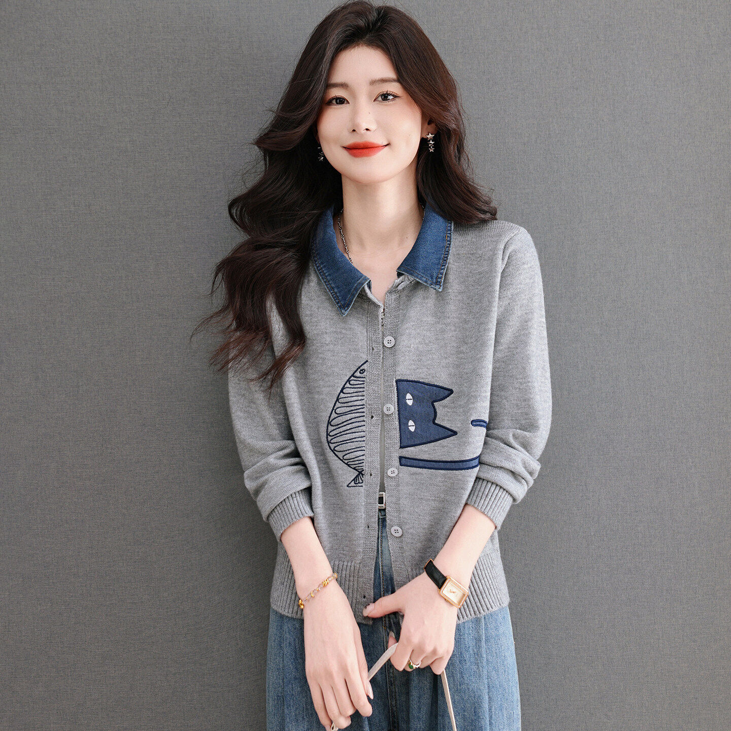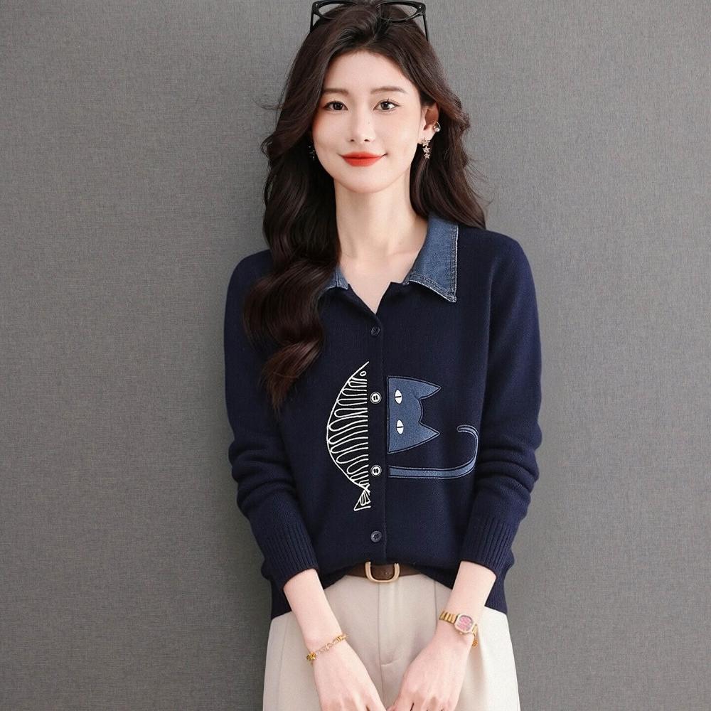 絮語精品熱銷🔥🔥 假兩件牛仔拼接翻領針織開衫女春薄款設計感刺繡減齡短毛衣外套 (輕薄針織衫 時尚女裝上衣 針織上衣 精緻上衣)