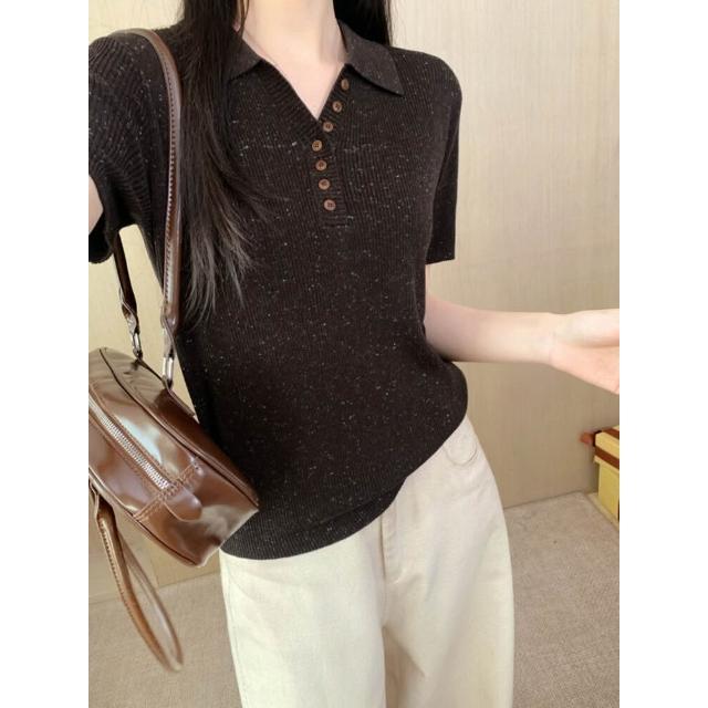 熱銷🔥🔥 短袖衫女夏季新款修身顯瘦天絲亞麻翻領坑條薄款針織T恤上衣 (輕薄針織衫 時尚女裝上衣 針織上衣 精緻上衣)