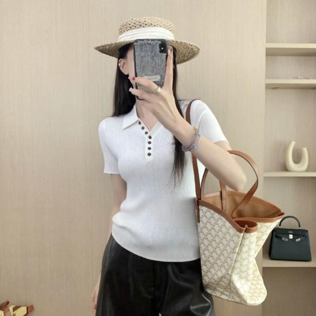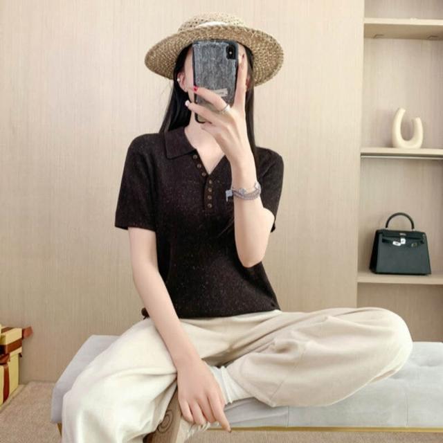 熱銷🔥🔥 短袖衫女夏季新款修身顯瘦天絲亞麻翻領坑條薄款針織T恤上衣 (輕薄針織衫 時尚女裝上衣 針織上衣 精緻上衣)