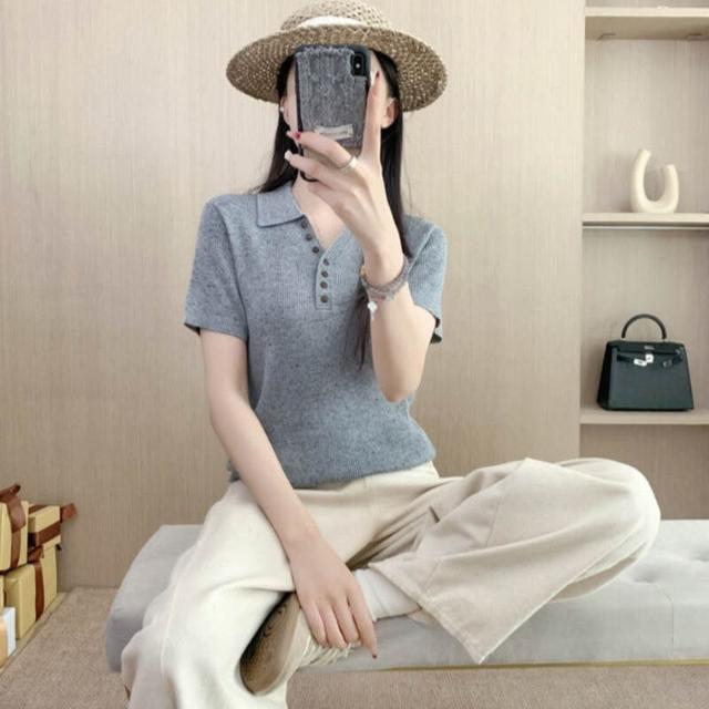 熱銷🔥🔥 短袖衫女夏季新款修身顯瘦天絲亞麻翻領坑條薄款針織T恤上衣 (輕薄針織衫 時尚女裝上衣 針織上衣 精緻上衣)