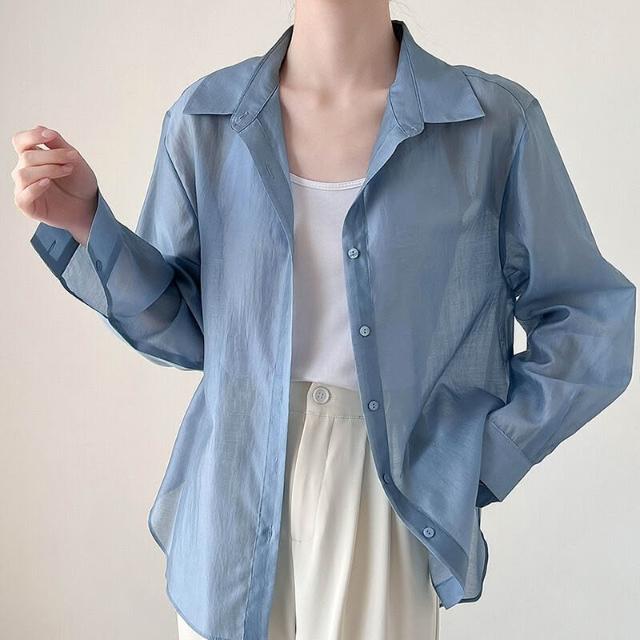 防曬上衣 小立領襯衫 雪紡襯衣 天絲白色防曬襯衫女通勤春夏季透感薄款寬松小眾度假上衣
