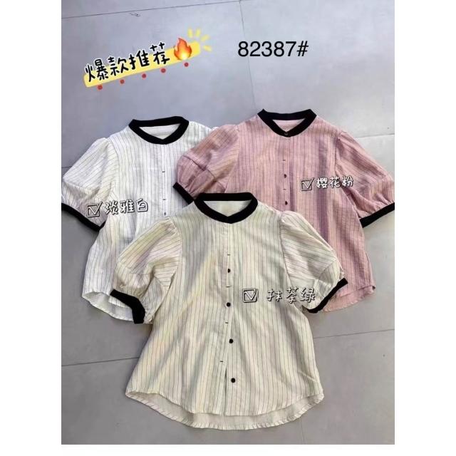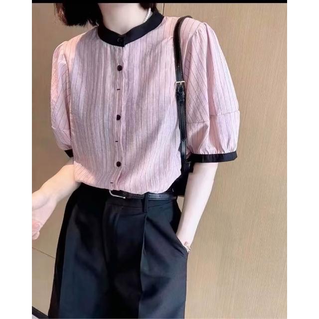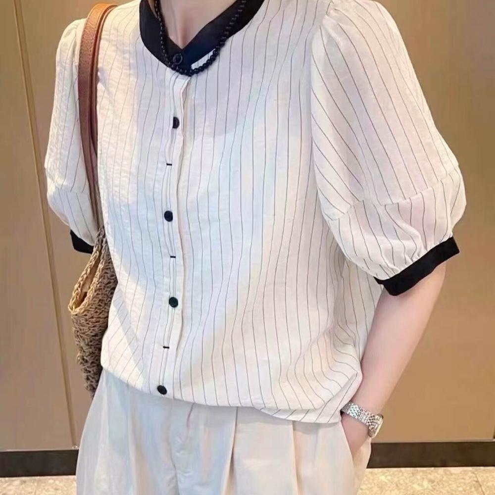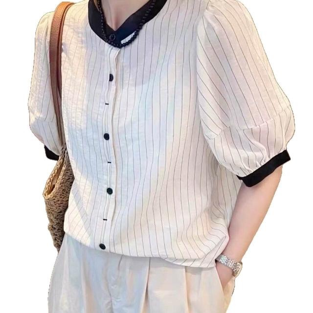 防曬上衣 小立領襯衫 雪紡襯衣 夏款襯衣短袖女條紋小黑領撞色襯衫短袖薄款新款短袖學院風