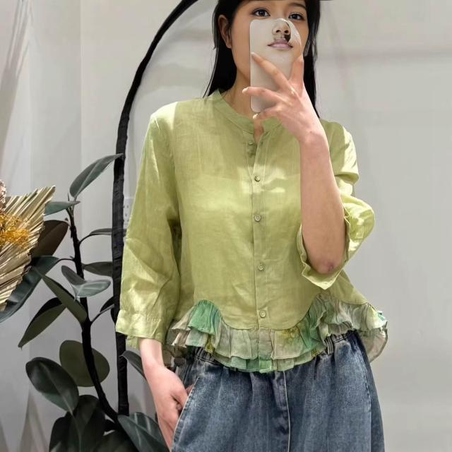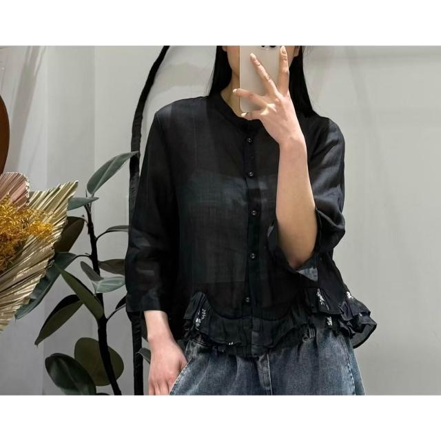 防曬上衣 小立領襯衫 雪紡襯衣 立領開襟排扣拼接花邊下擺七分袖設計感文藝復古女寬松薄款娃娃衫