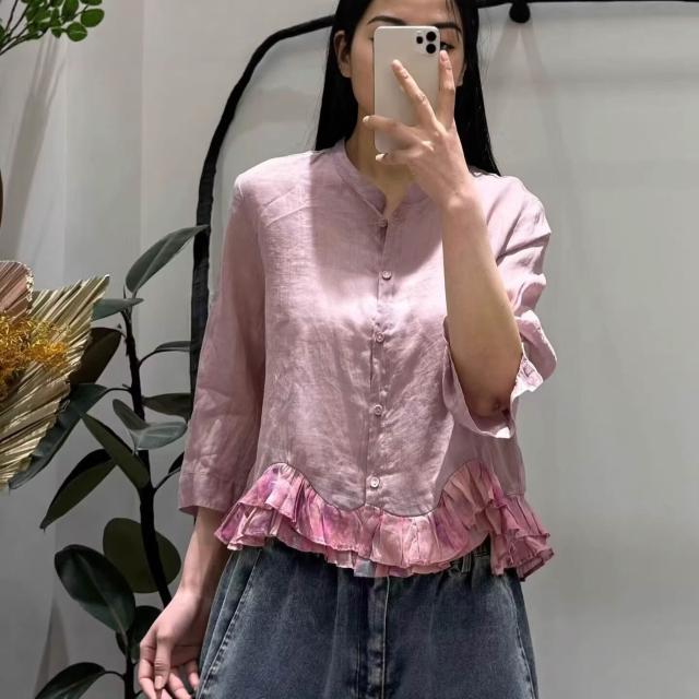 防曬上衣 小立領襯衫 雪紡襯衣 立領開襟排扣拼接花邊下擺七分袖設計感文藝復古女寬松薄款娃娃衫