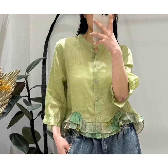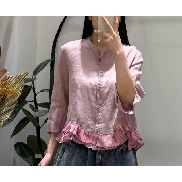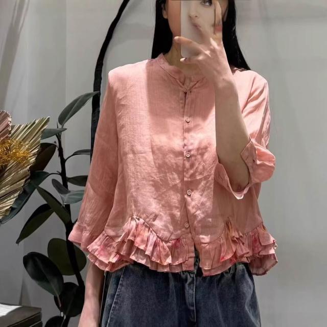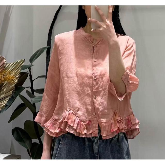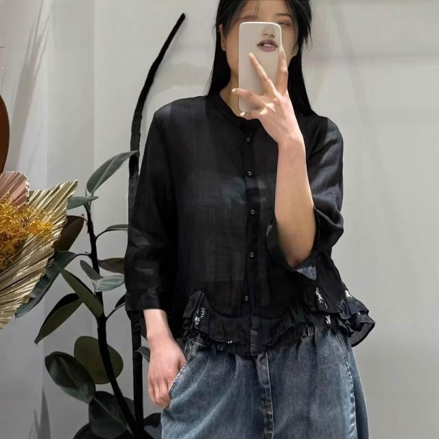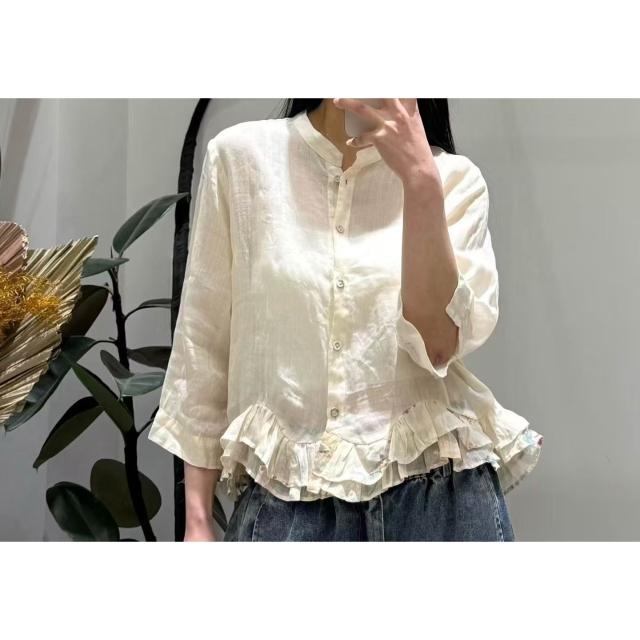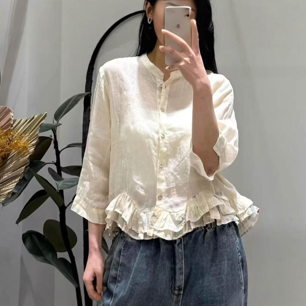 防曬上衣 小立領襯衫 雪紡襯衣 立領開襟排扣拼接花邊下擺七分袖設計感文藝復古女寬松薄款娃娃衫