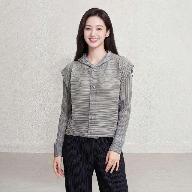 防曬上衣 小立領襯衫 雪紡襯衣 春季新款三宅風褶皺上衣女時尚紫色立領單排扣寬松港味風琴褶襯衫