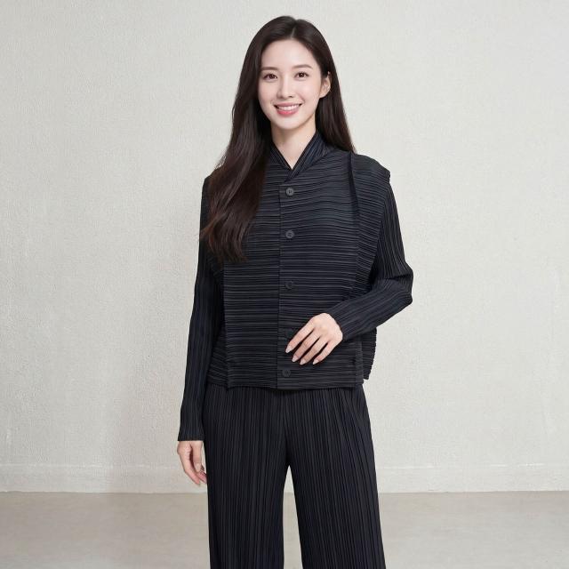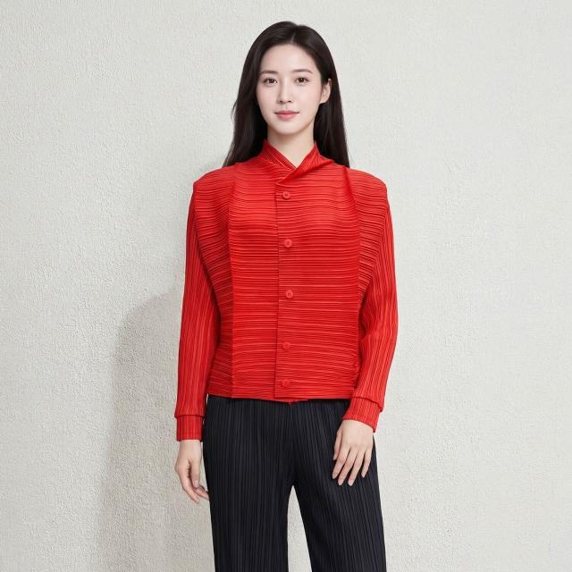 防曬上衣 小立領襯衫 雪紡襯衣 春季新款三宅風褶皺上衣女時尚紫色立領單排扣寬松港味風琴褶襯衫