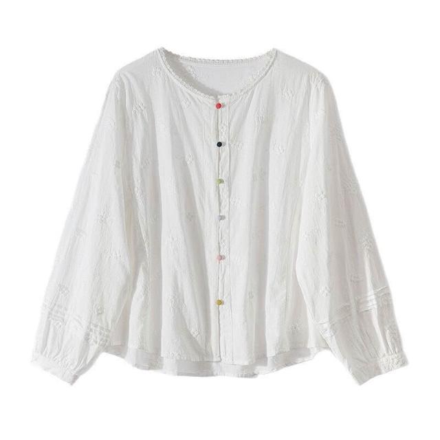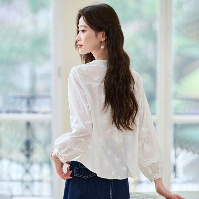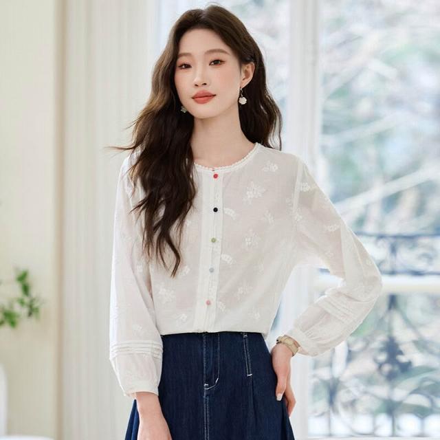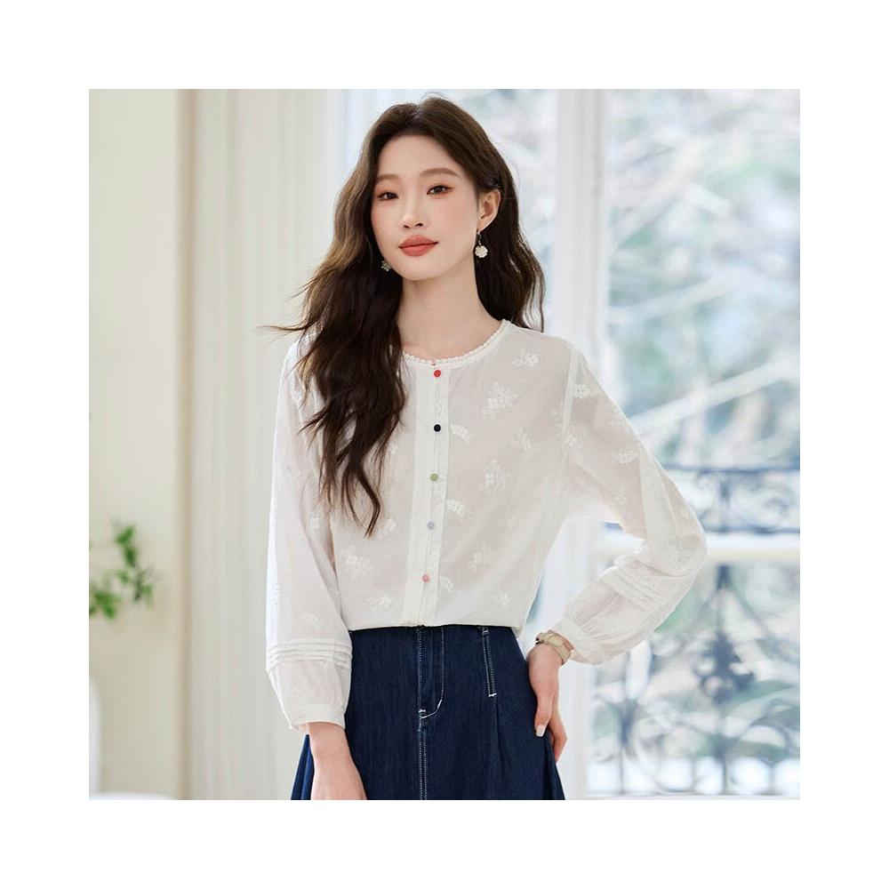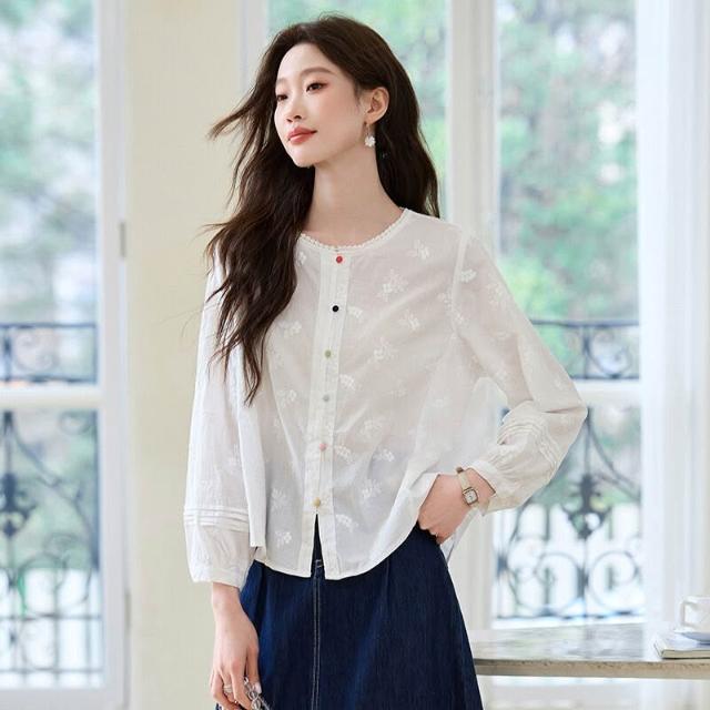 防曬上衣 小立領襯衫 雪紡襯衣 純棉圓領襯衫女長袖春夏新款刺繡薄款防曬空調衫上衣短款外套