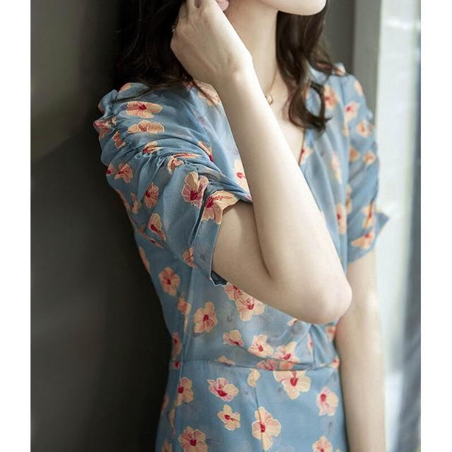 碎花連衣裙 高端魚尾裙 媽媽夏裝 真絲碎花連衣裙女夏新款氣質V領高端桑蠶絲魚尾裙