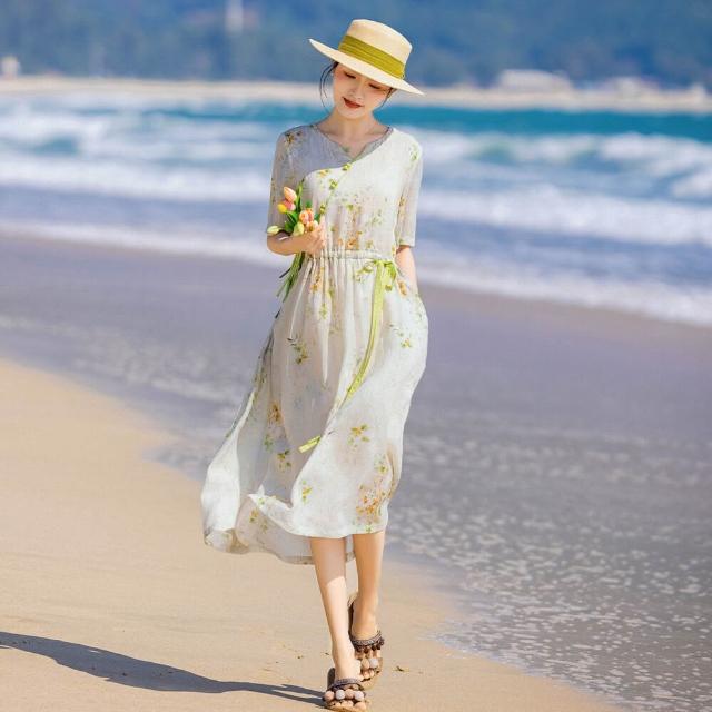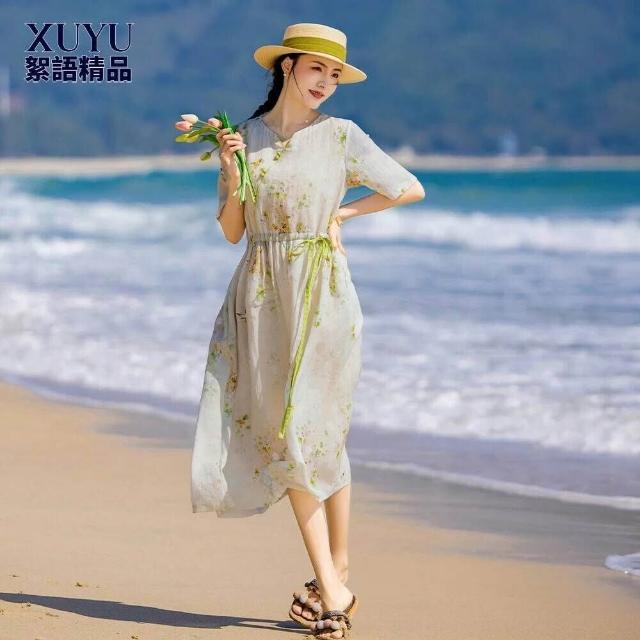 連衣裙 綁帶短裙 碎花裙 夏季新款復古高端苎麻印花連衣裙短袖系帶文藝女裝