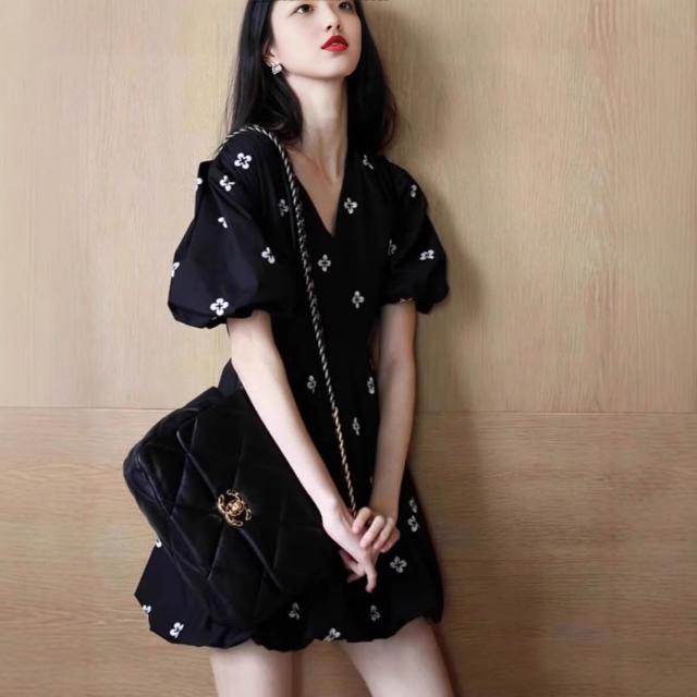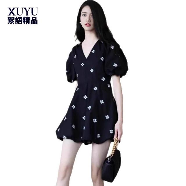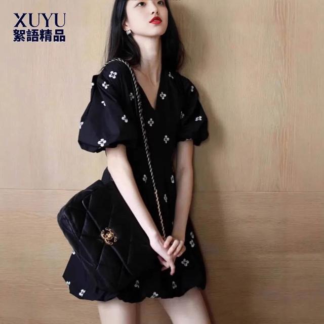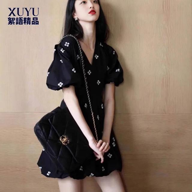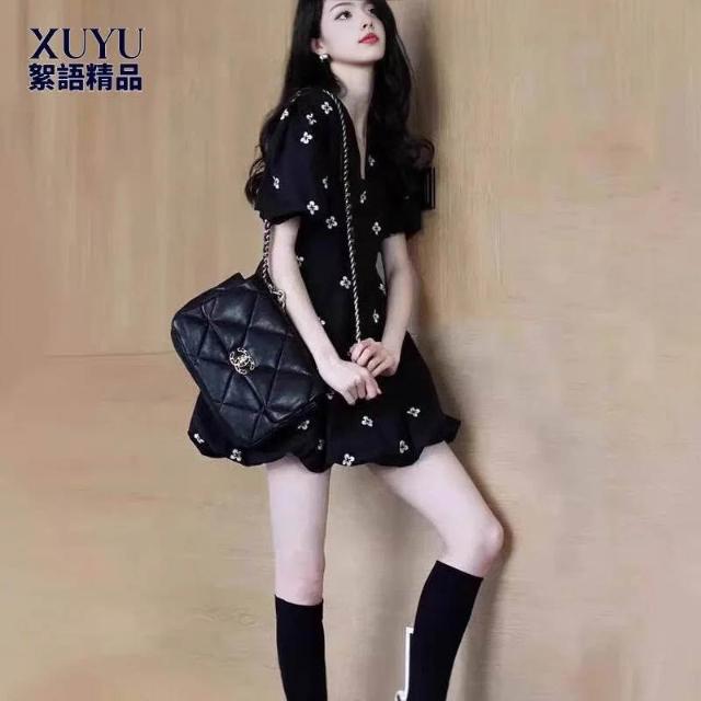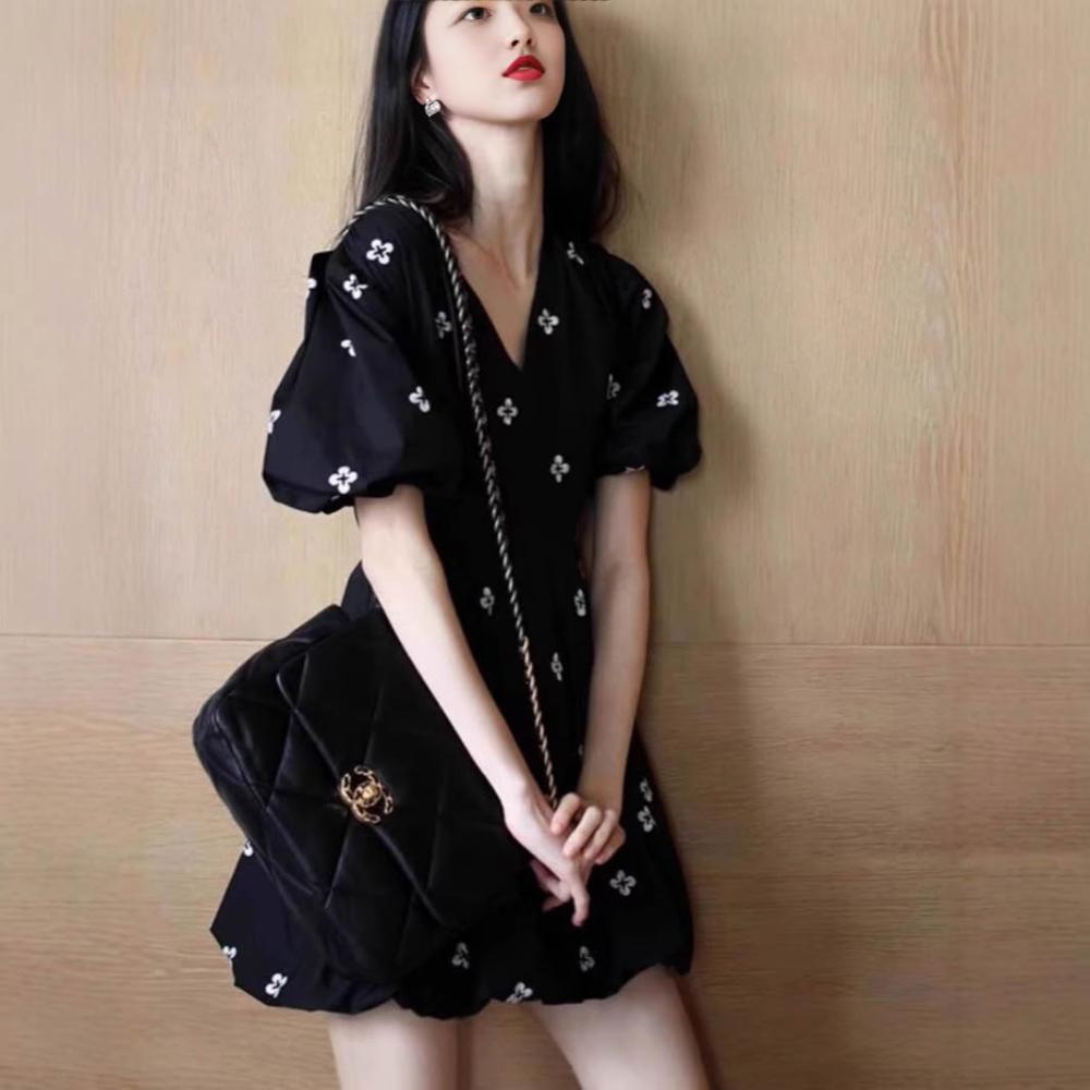 連衣裙 綁帶短裙 碎花裙 法式復古設計感花朵短袖V領連衣裙子女夏季新款小個子減齡