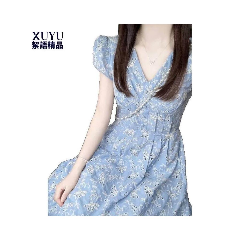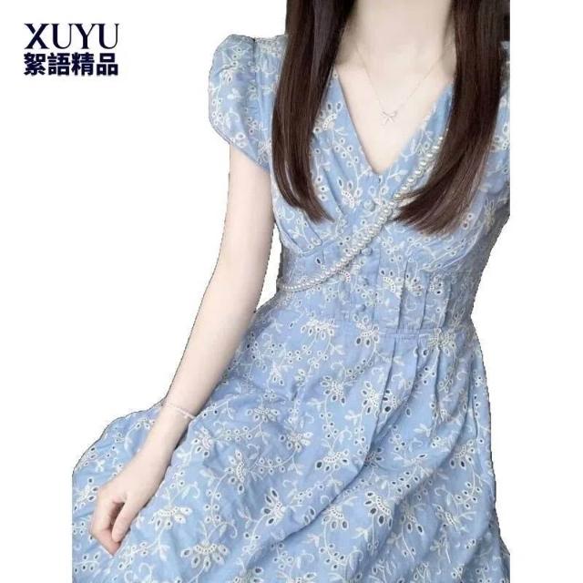 連衣裙 綁帶短裙 碎花裙 高級感重工刺繡藍色桔梗法式連衣裙女夏季新款小個子收腰顯瘦裙子