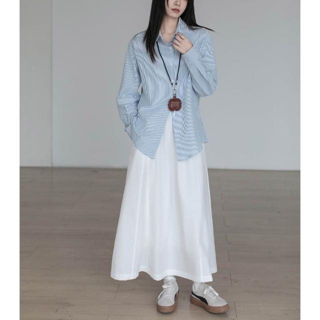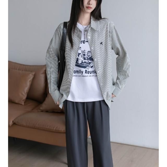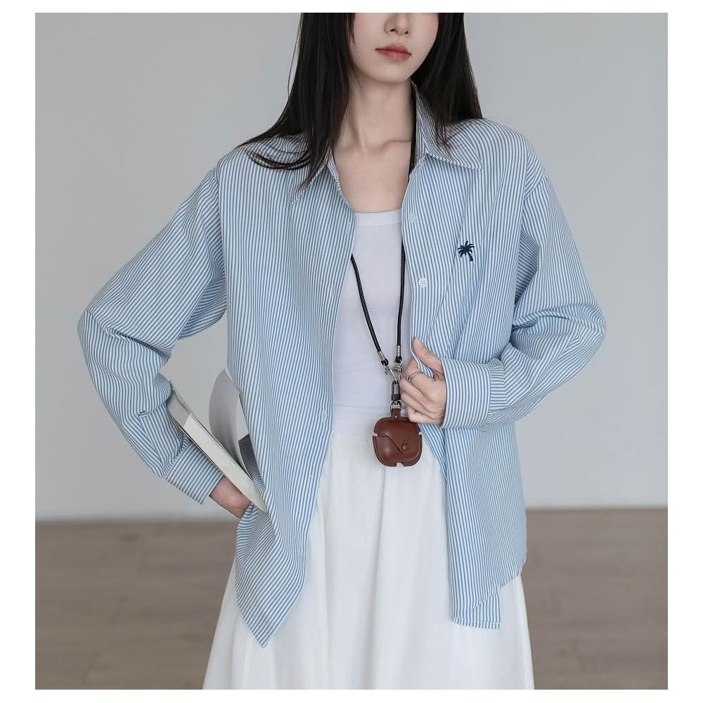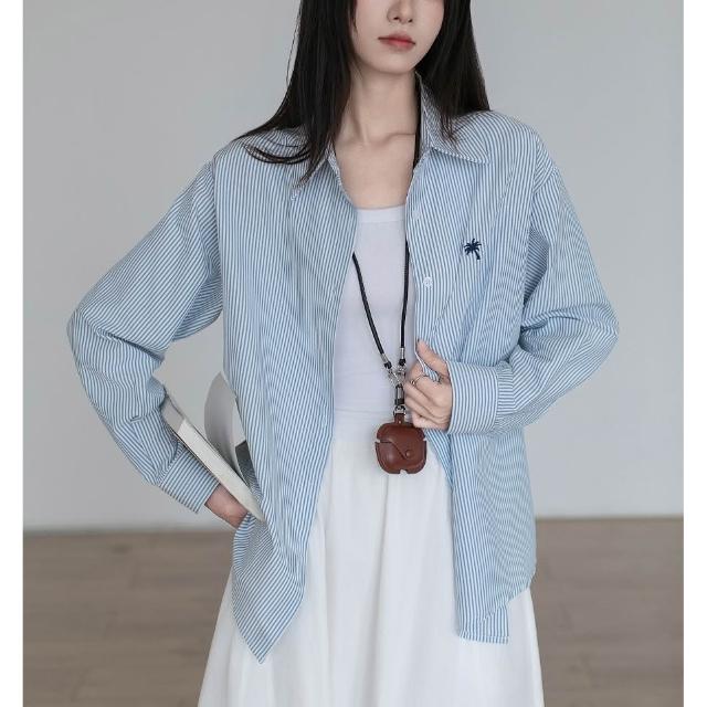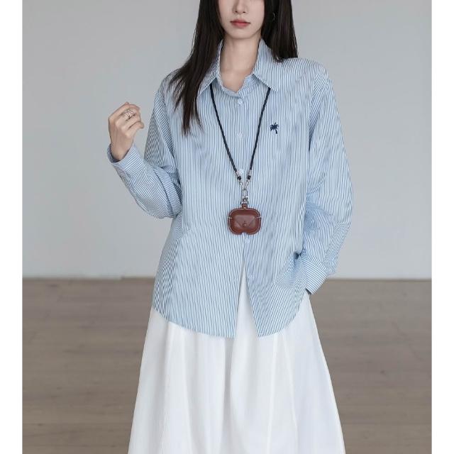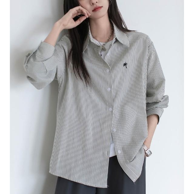 女裝 上衣 短袖T恤 亞麻上衣 純棉T恤 真絲上衣 實拍戶外少女翻領撞色條紋襯衫微皺肌理感優雅刺繡長袖襯衣防曬服