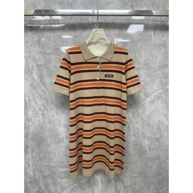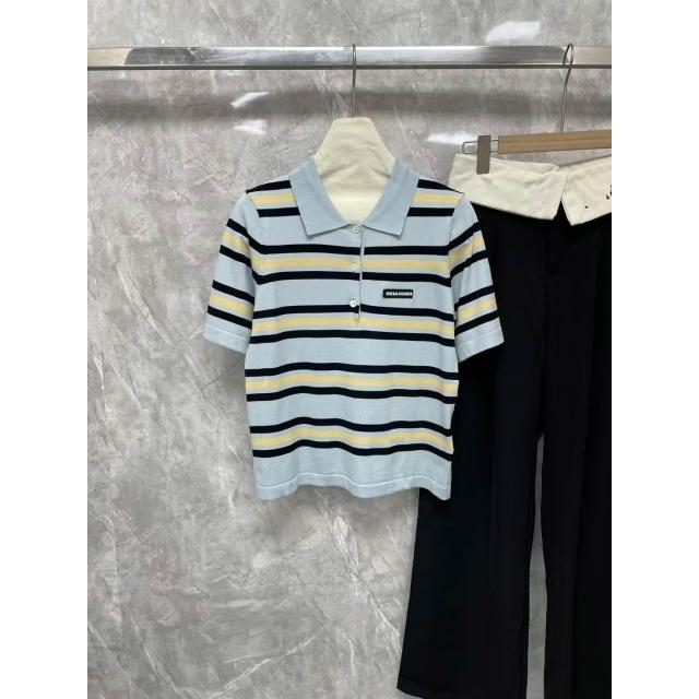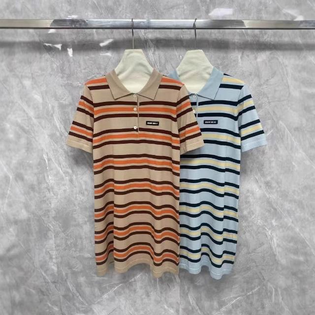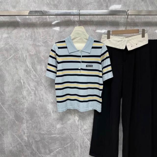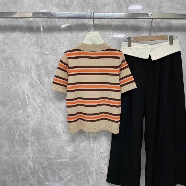 女裝 上衣 短袖T恤 亞麻上衣 純棉T恤 真絲上衣 夏季新款女裝字母徽標貼布刺繡條紋針織短袖polo衫