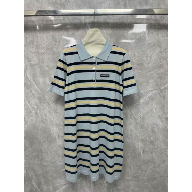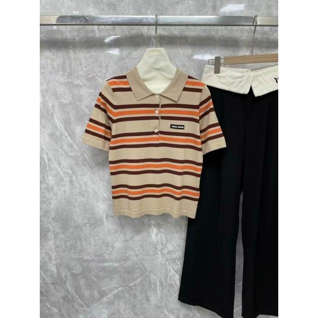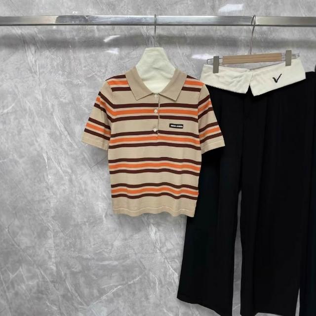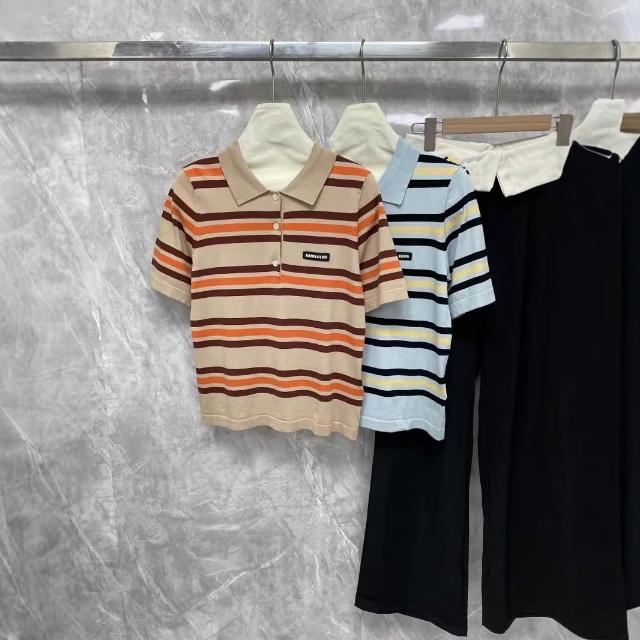 女裝 上衣 短袖T恤 亞麻上衣 純棉T恤 真絲上衣 夏季新款女裝字母徽標貼布刺繡條紋針織短袖polo衫