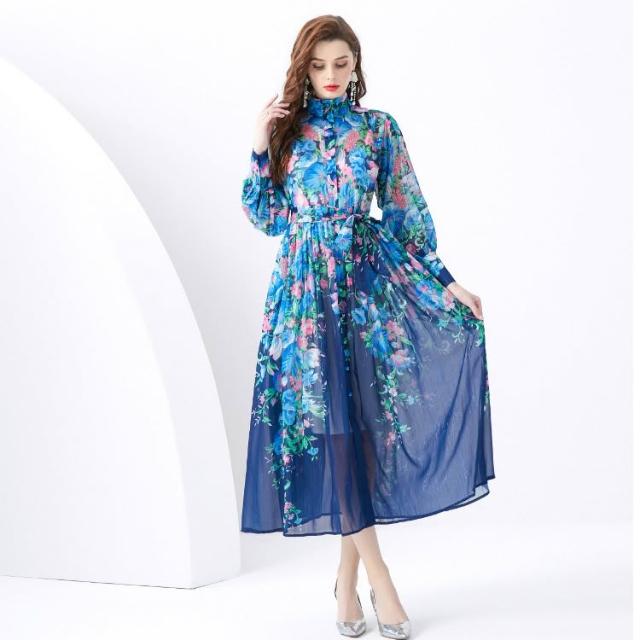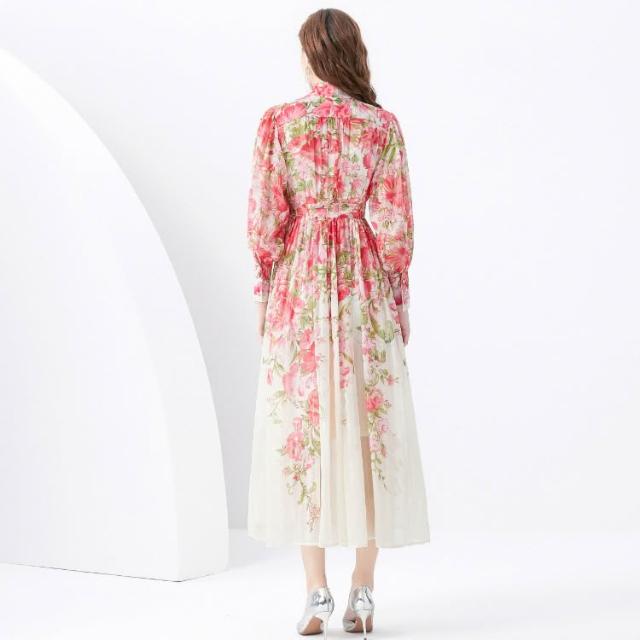絮語精品女裝 下著 半身裙長裙 吊帶裙 連衣裙 印花連衣裙女立領長袖高級感收腰綁帶長裙法式雪紡仙女裙