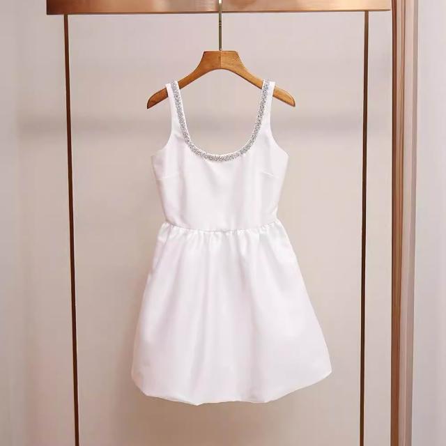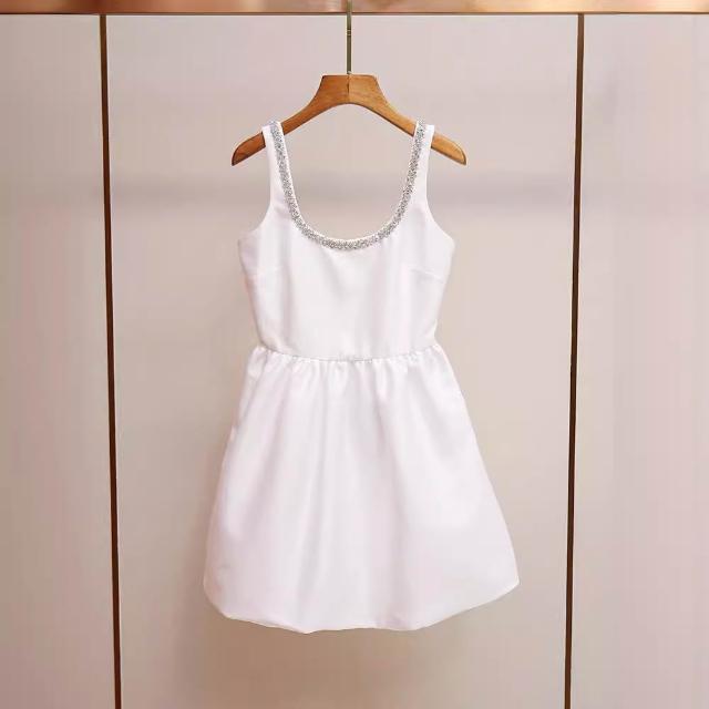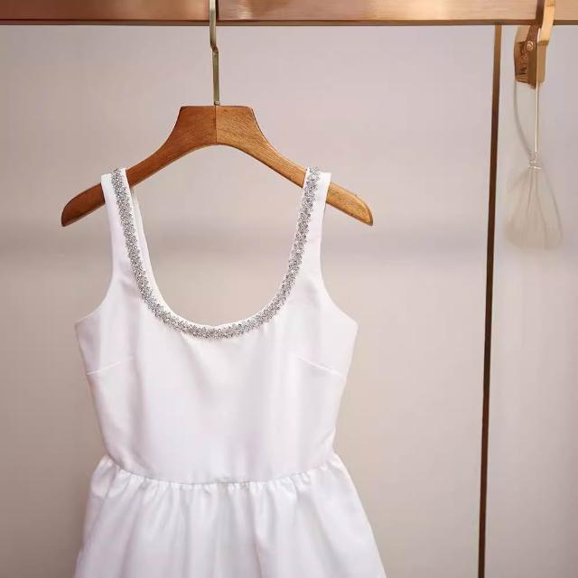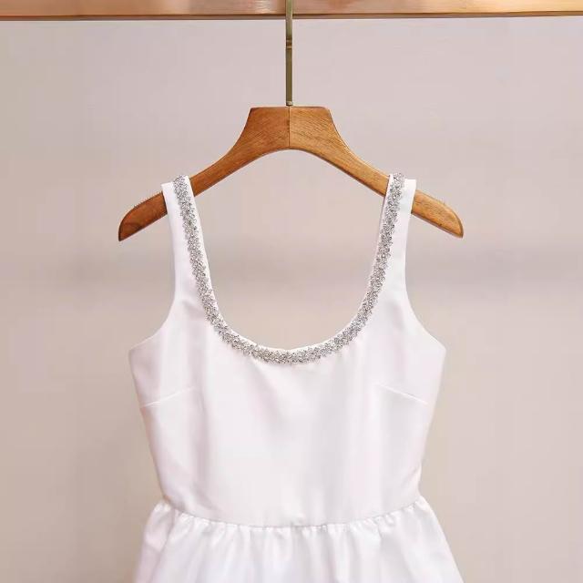 絮語精品女裝 下著 半身裙長裙 吊帶裙 連衣裙 夏季新款法式名媛風白色A字短款鑲鉆U型領露背吊帶連衣裙女