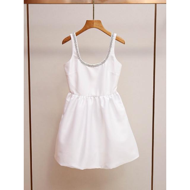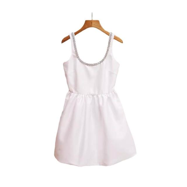 絮語精品女裝 下著 半身裙長裙 吊帶裙 連衣裙 夏季新款法式名媛風白色A字短款鑲鉆U型領露背吊帶連衣裙女