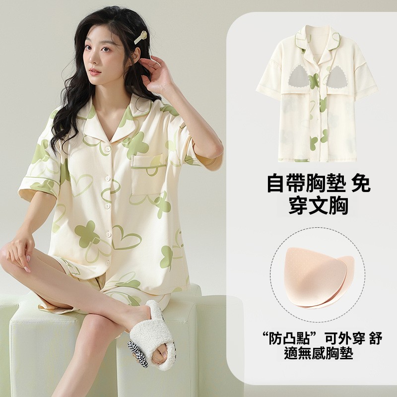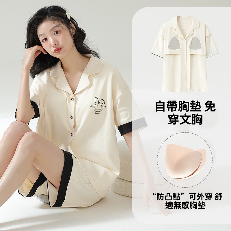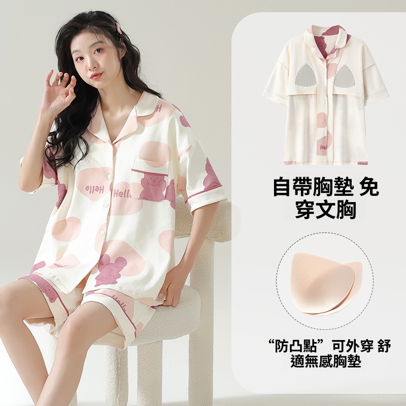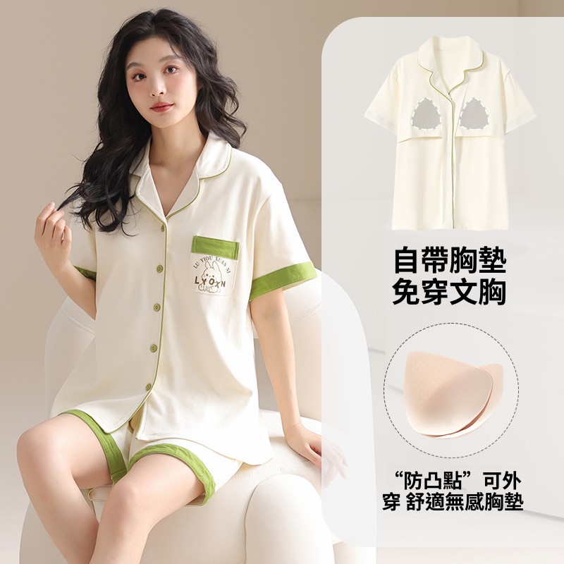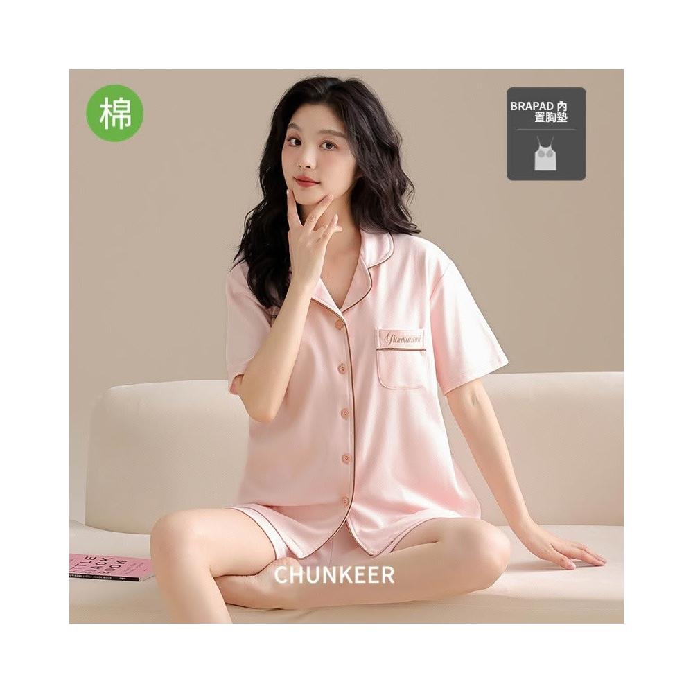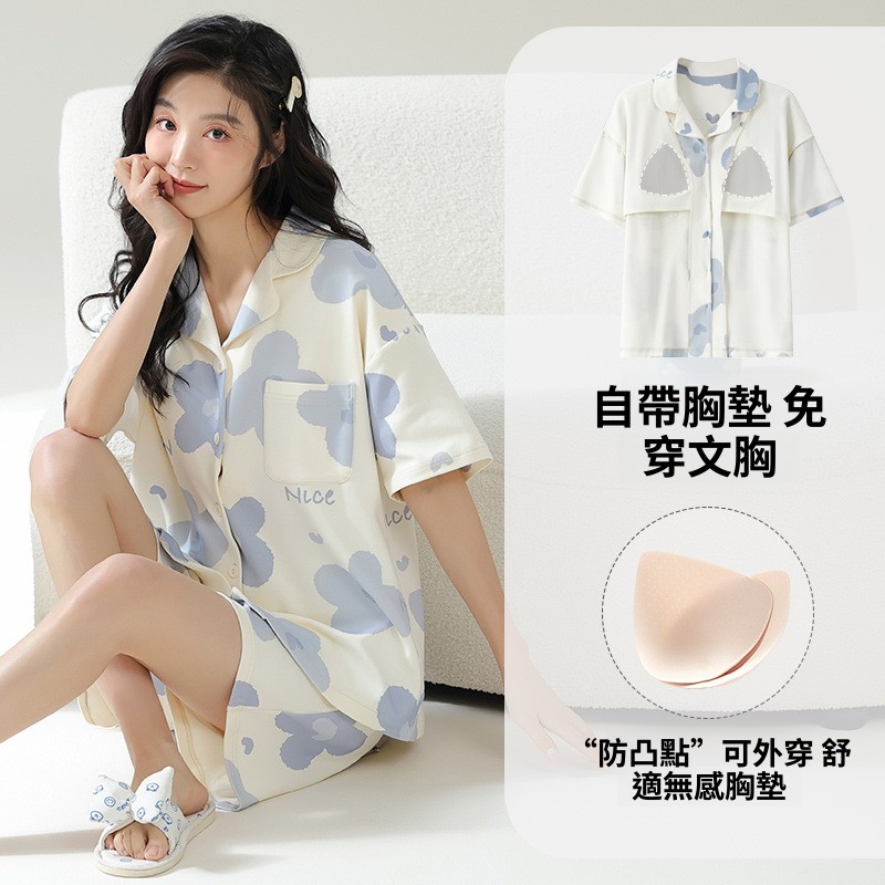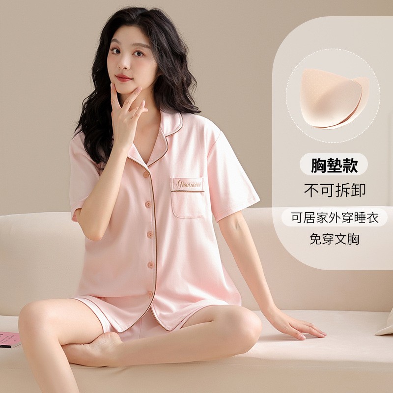 絮語精品家居服 冰絲睡衣 純棉 寬鬆舒適 廠家直銷睡衣女士家居服純棉薄款夏季時尚帶胸墊寬松套裝簡約新款