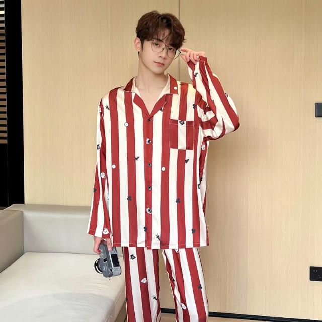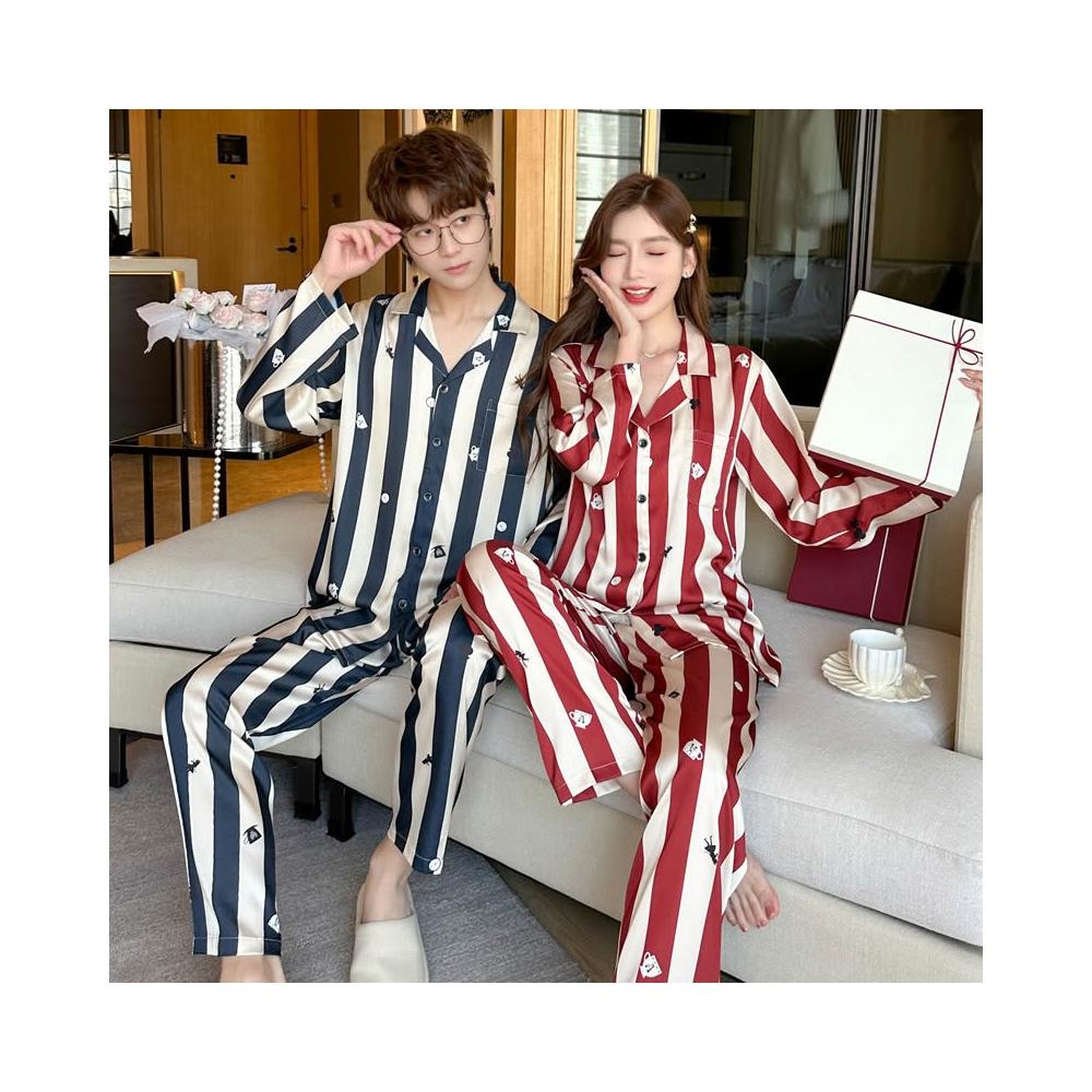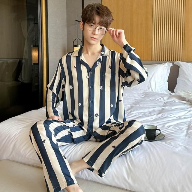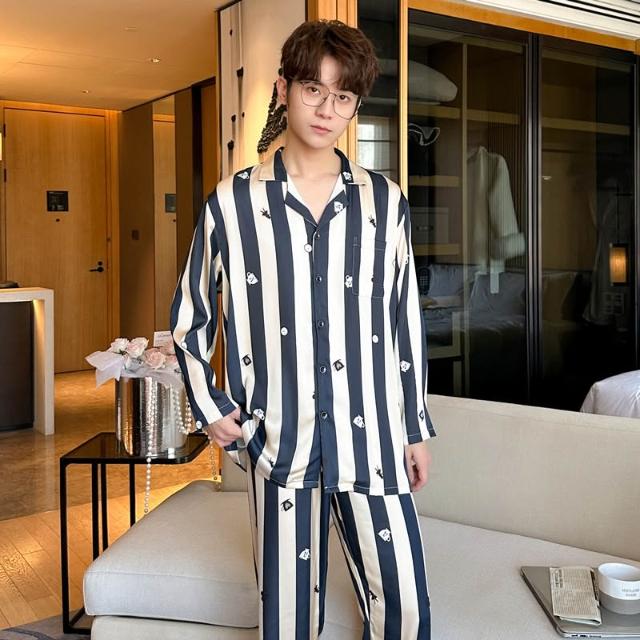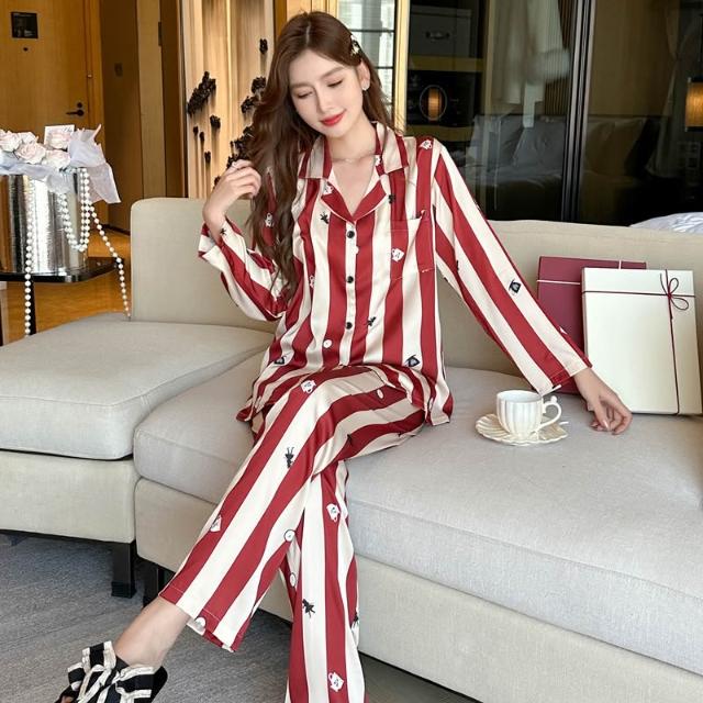 絮語精品可外穿家居服 綢緞家居服 休閑家居服 冰絲睡衣 情侶睡衣女夏薄款冰絲長袖長褲印花開衫高級感大碼外穿家居服套裝