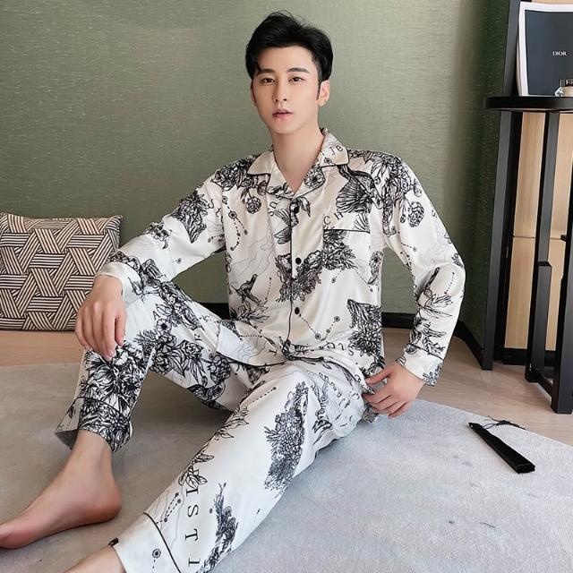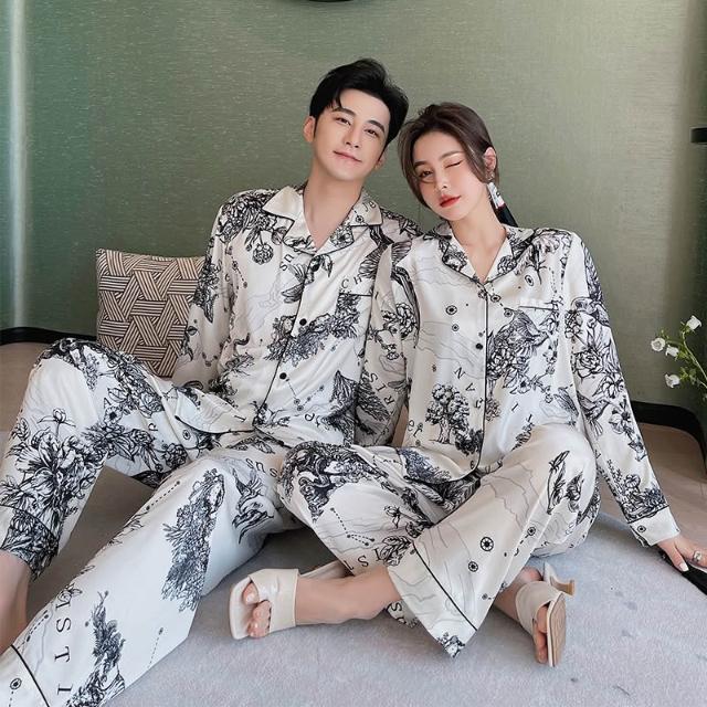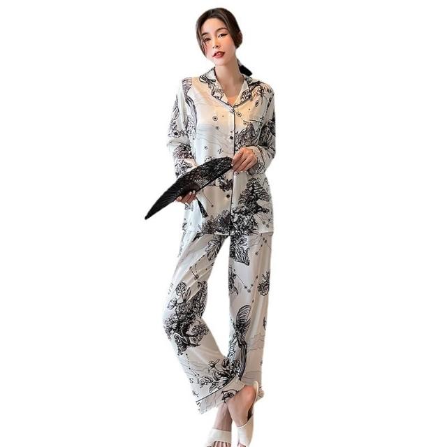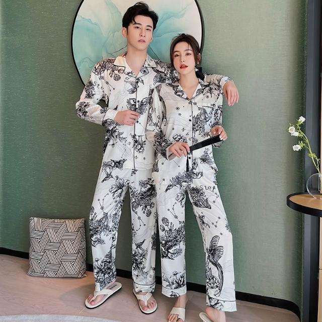 絮語精品可外穿家居服 綢緞家居服 休閑家居服 冰絲睡衣 新款款植物黑白水墨畫情侶男女款睡衣冰絲家居服絲綢睡衣