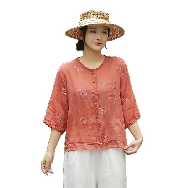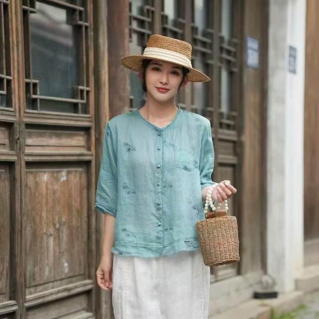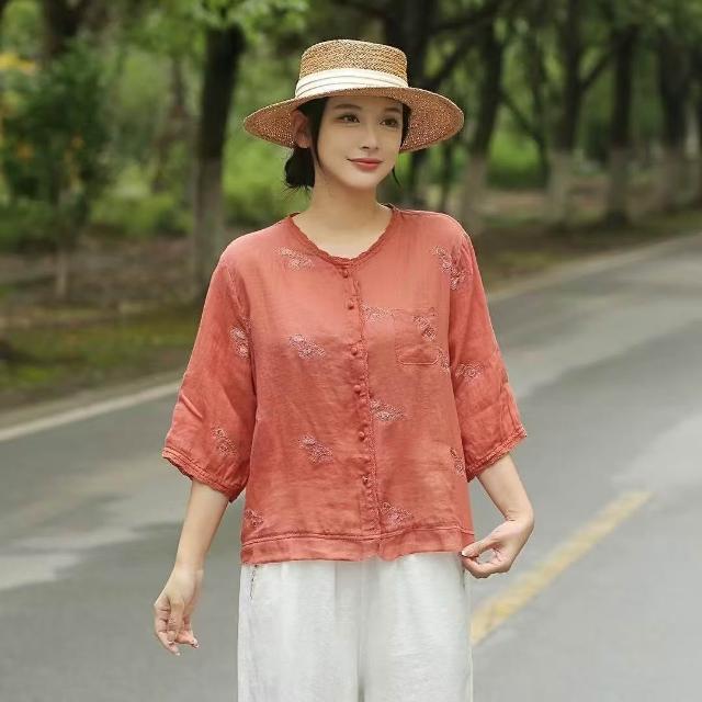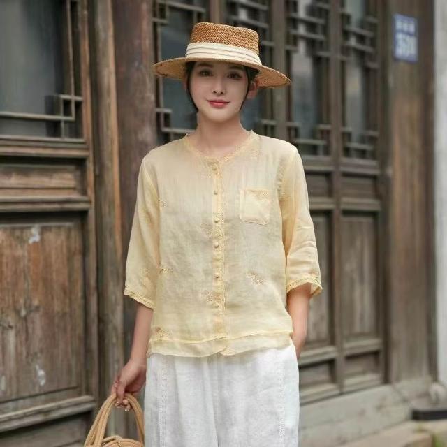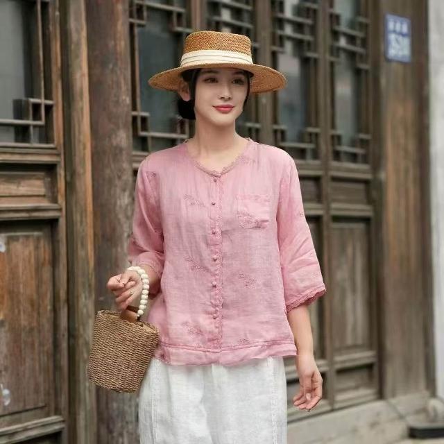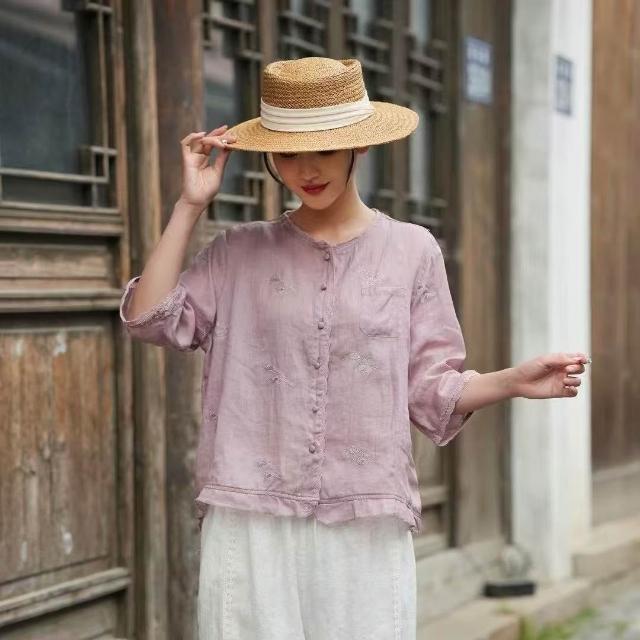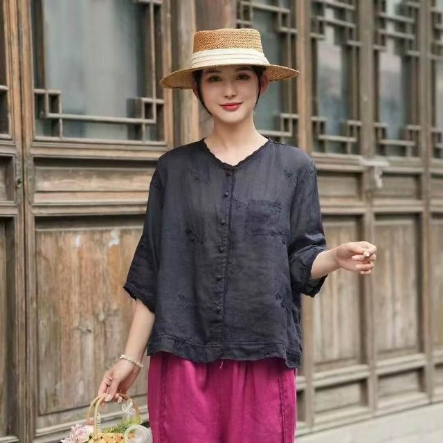 絮語精品長袖襯衫女 薄款襯衫 寬松小衫 顯瘦襯衫上衣 夏新款襯衣五分袖圓領苎麻襯衫文藝刺繡國風復古寬松民族風短袖