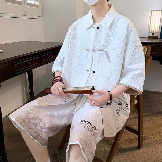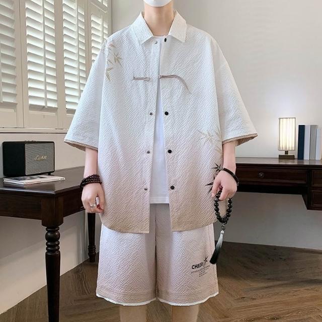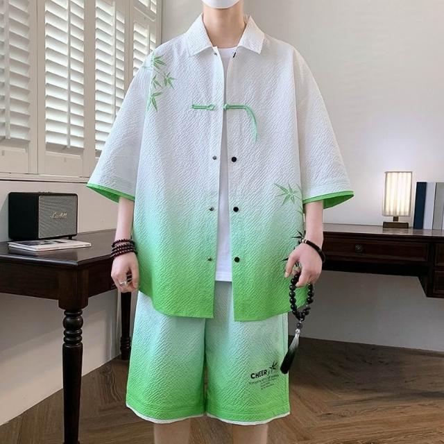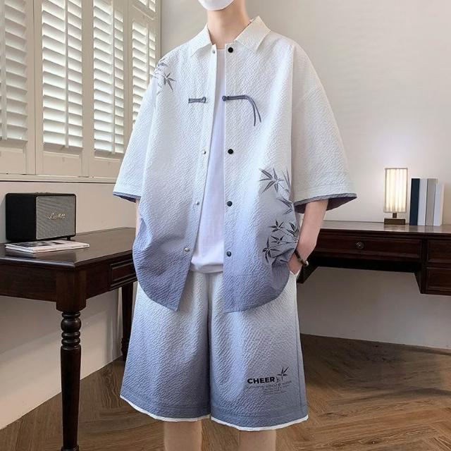 絮語精品休閑男裝套裝 立領透氣上衣 休閑寬松襯衫 短袖襯衫 新中式國風套裝男款夏款漸變痞帥襯衫短袖短褲國風穿搭一套衣服