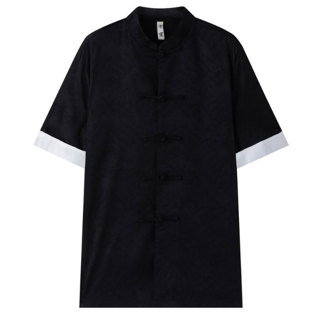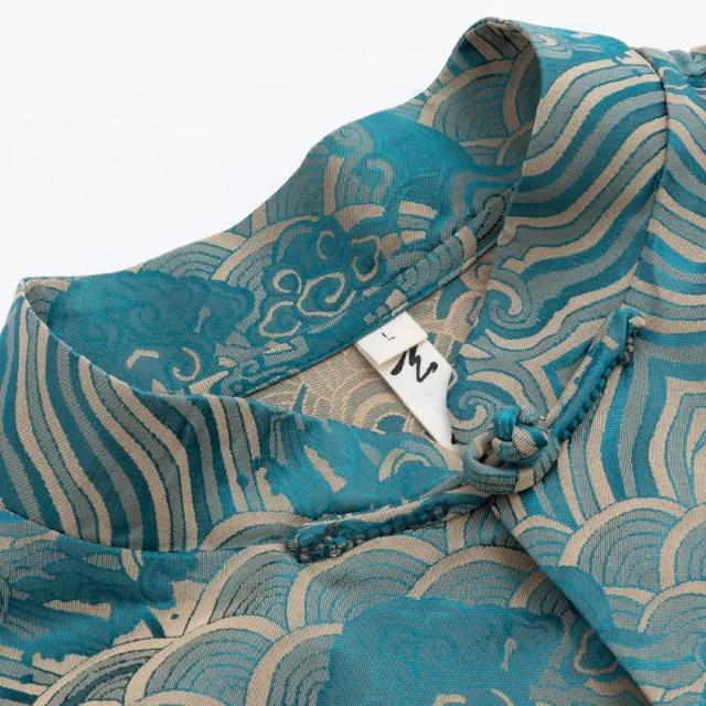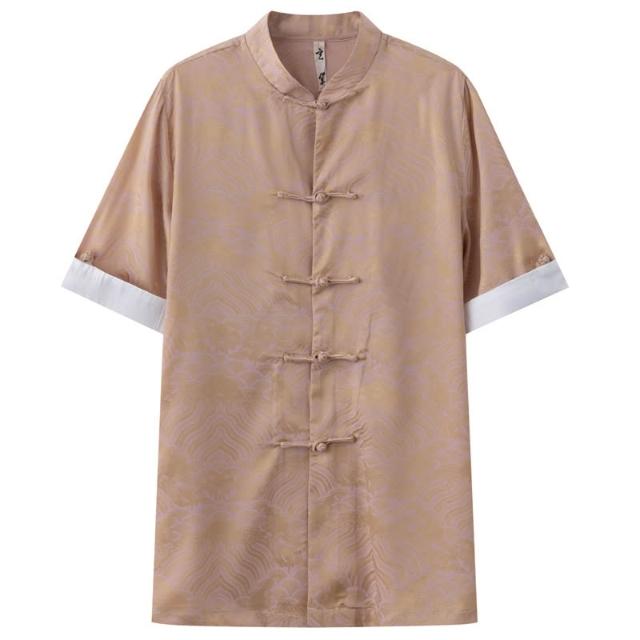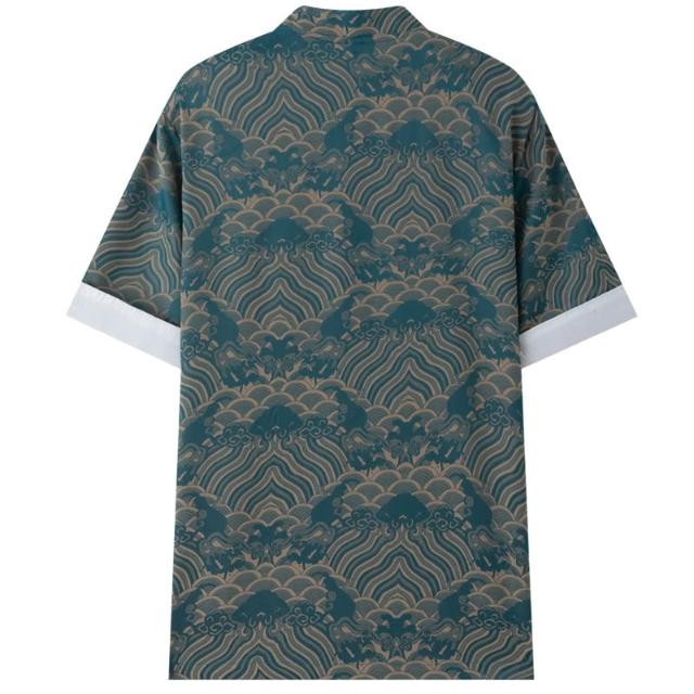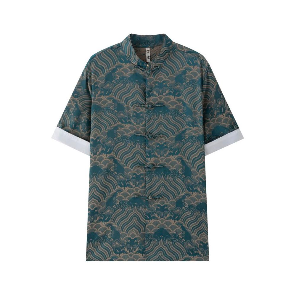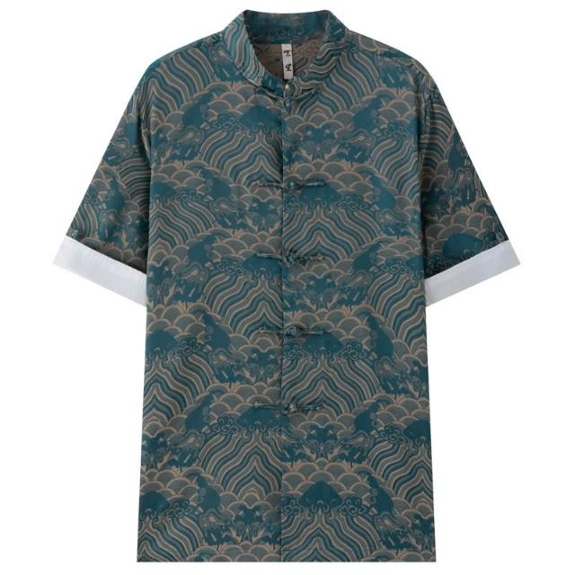 絮語精品休閑男裝套裝 立領透氣上衣 休閑寬松襯衫 短袖襯衫 夏季唐裝男中式改良印花短袖外套男中國風復古手工盤扣國潮上衣男