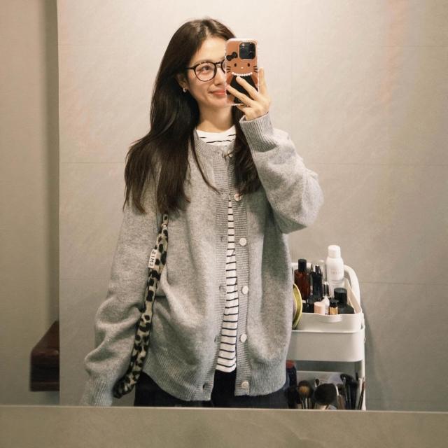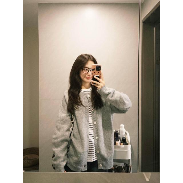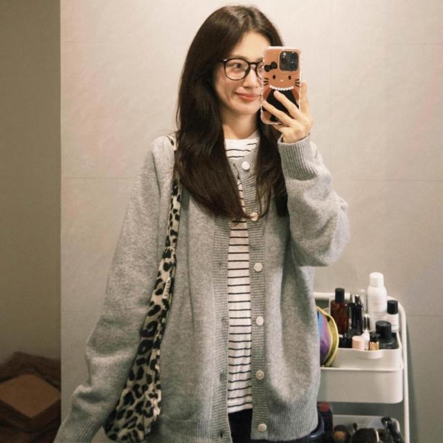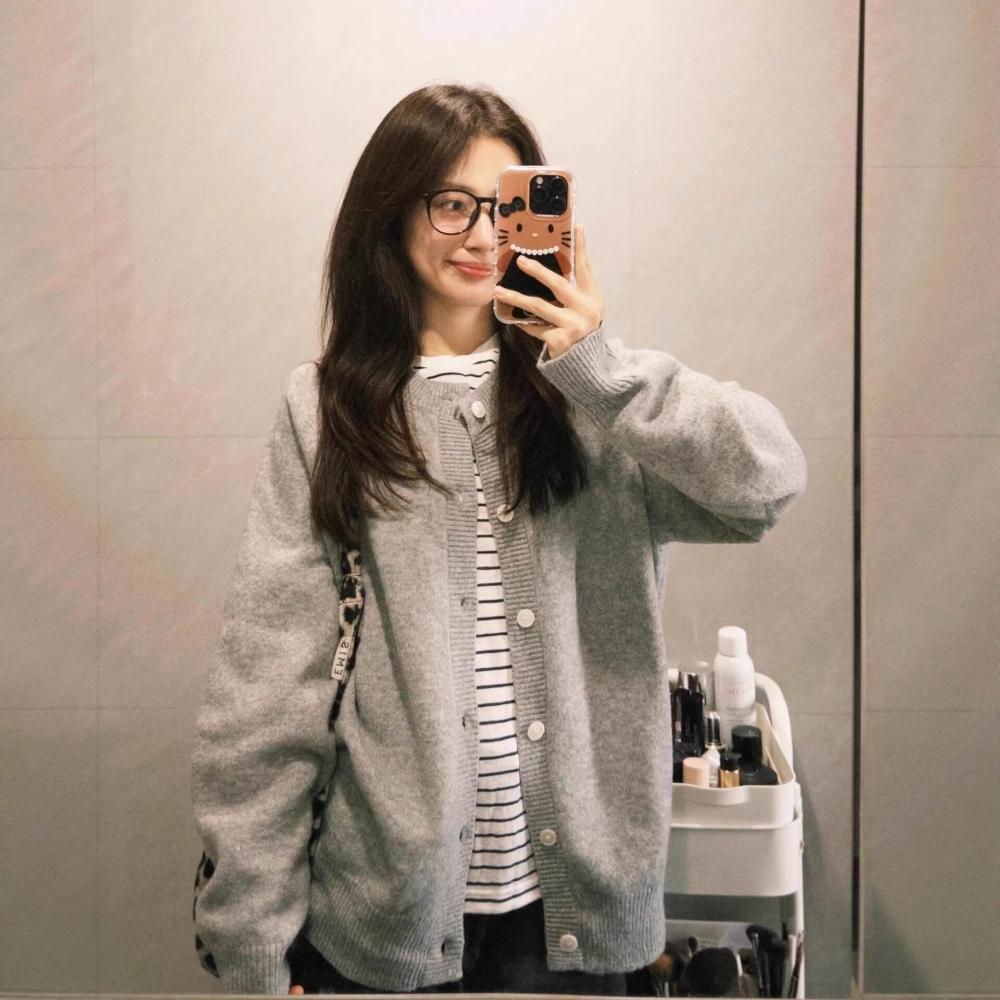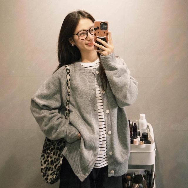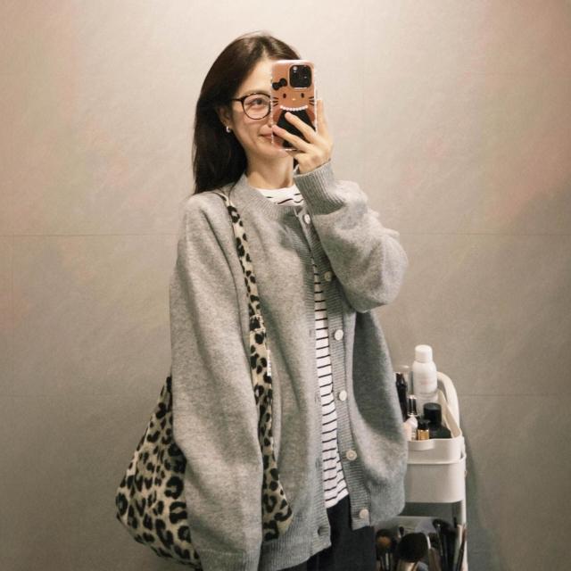 韓系早秋季復古灰色針織開衫毛衣女裝寬松外搭慵懶風休閑外套上衣