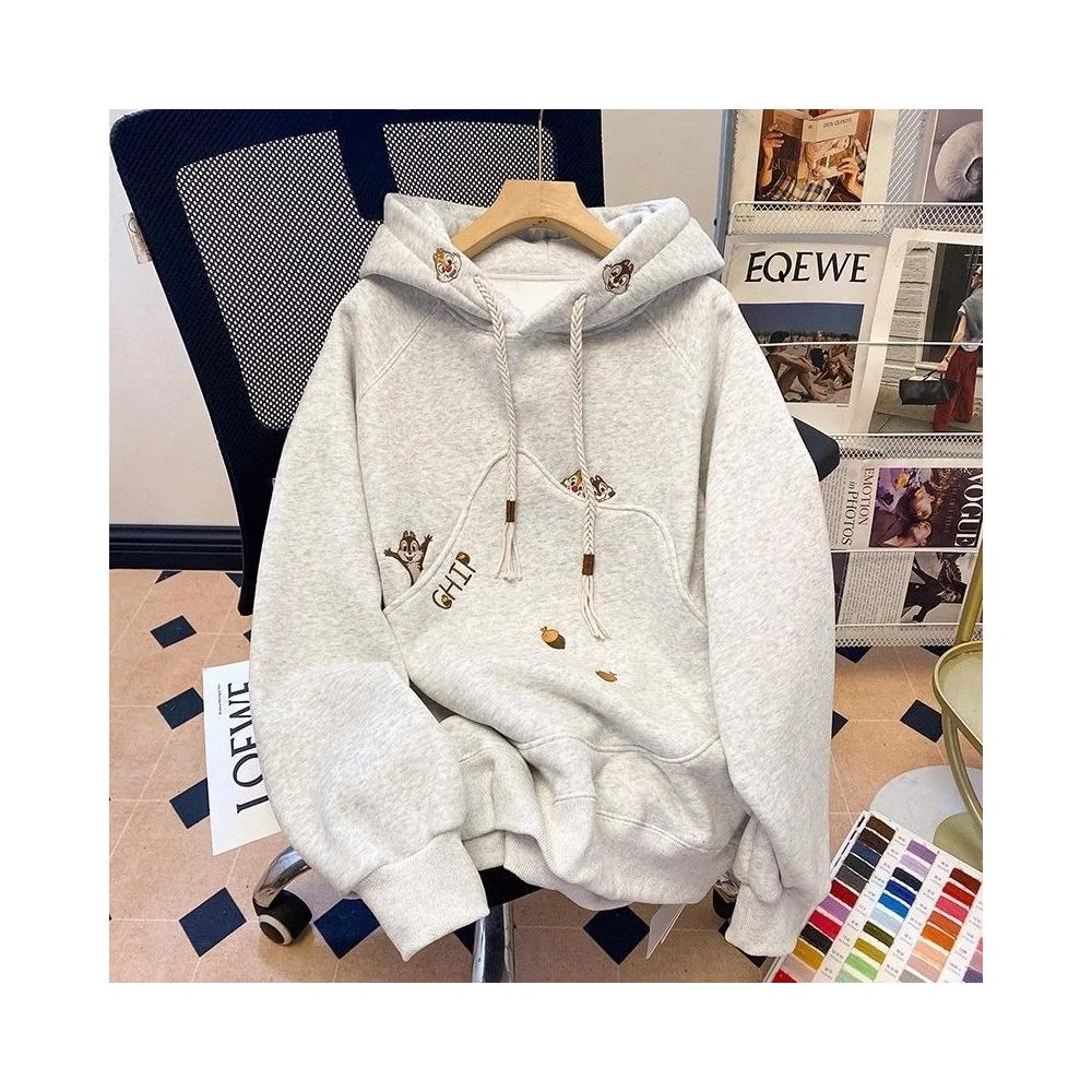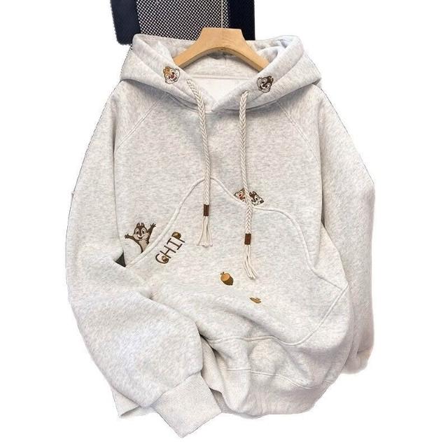 韓版卡通刺繡連帽衛衣女春秋冬加絨加厚寬松慵懶風高級感灰色外套