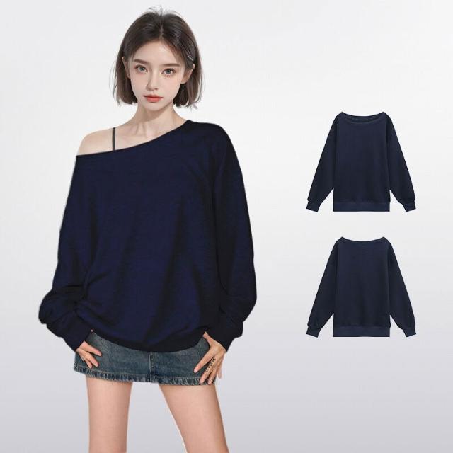 藏青色斜肩露肩套頭衛衣女春秋款寬松慵懶漏肩上衣初秋趙露思同款