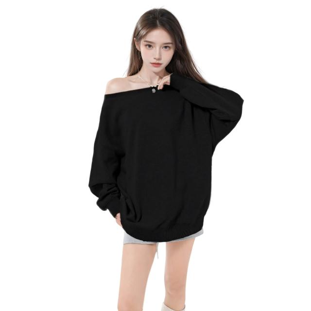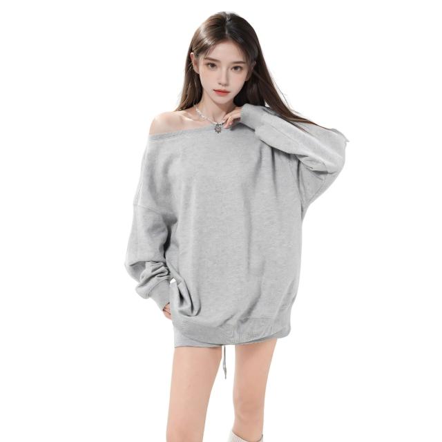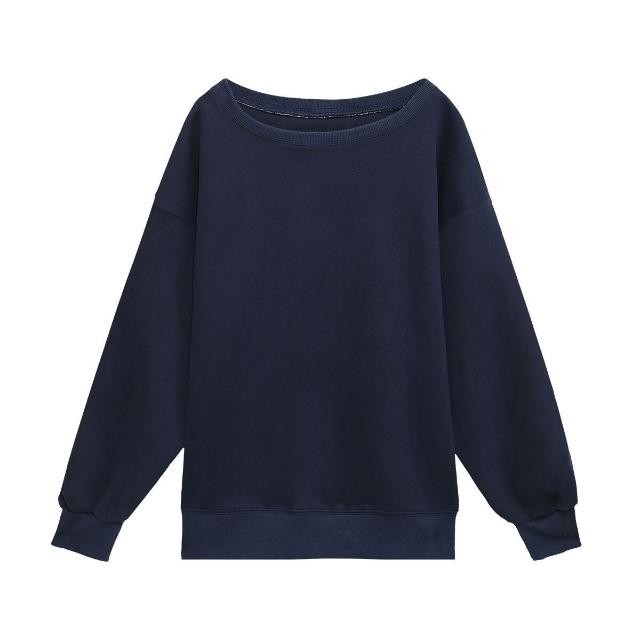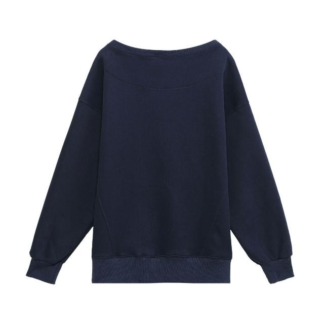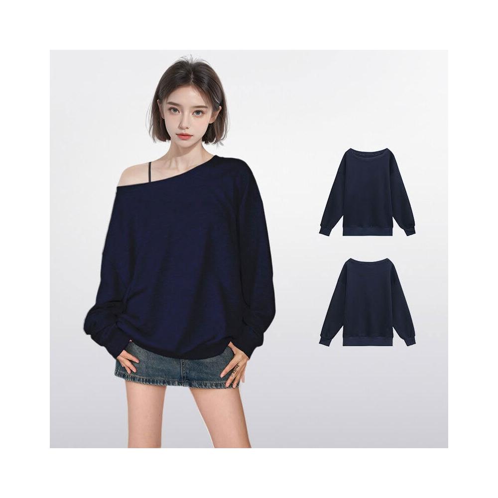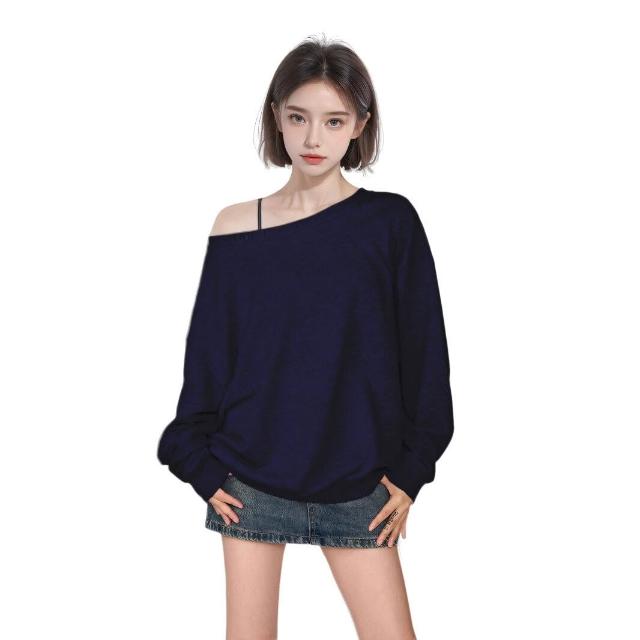 藏青色斜肩露肩套頭衛衣女春秋款寬松慵懶漏肩上衣初秋趙露思同款
