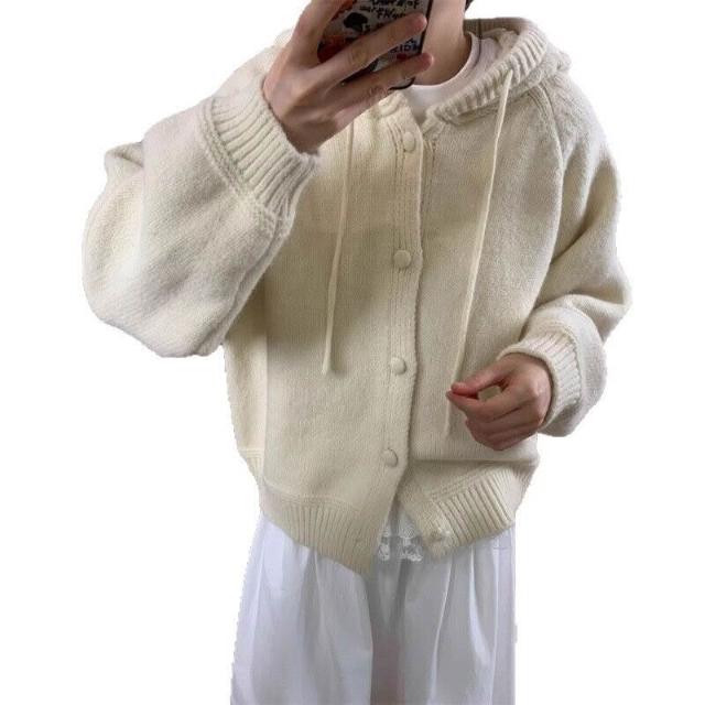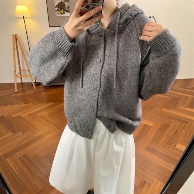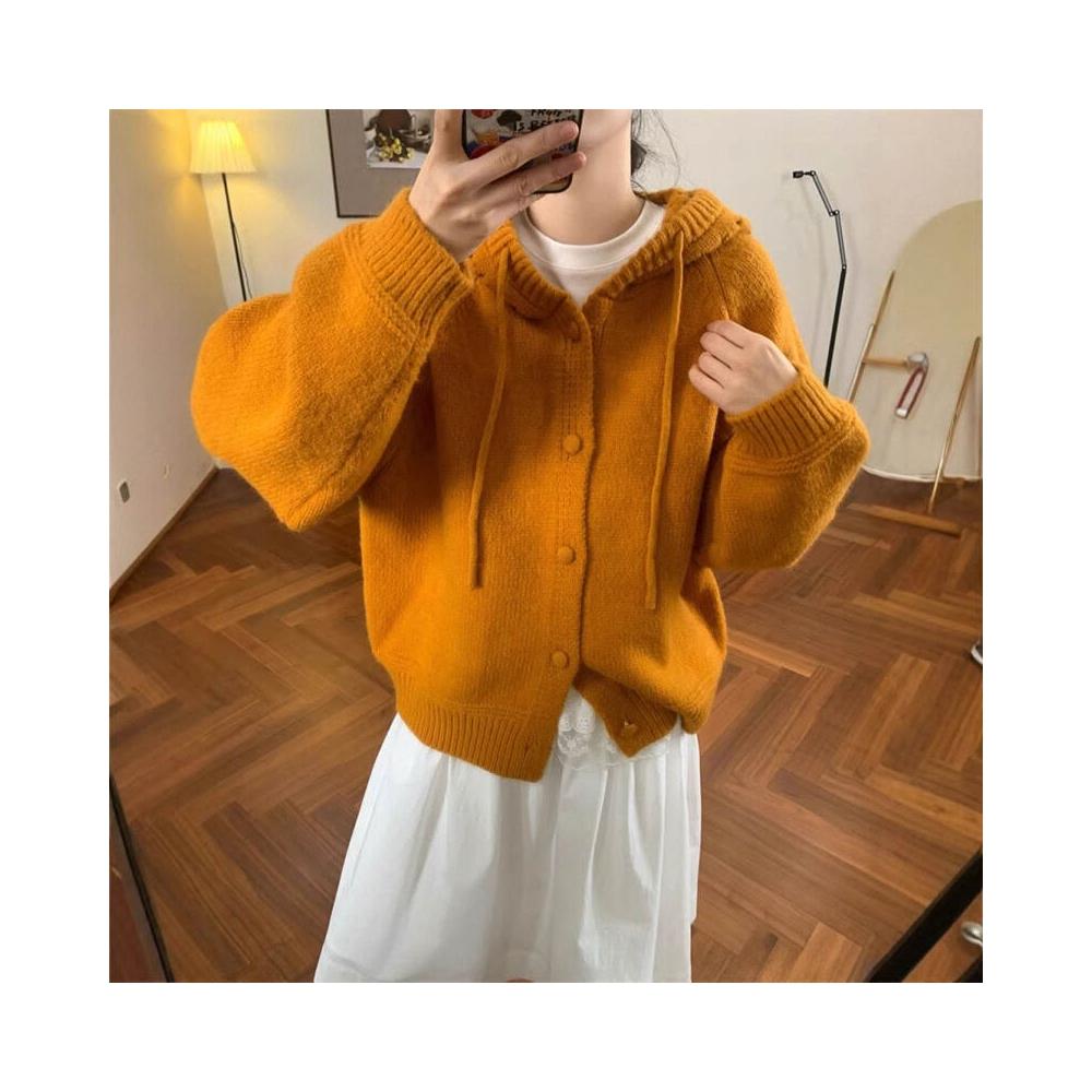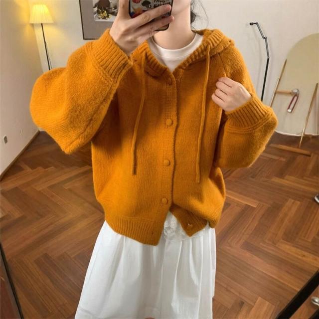 南瓜橘色韓系復古連帽毛衣外套女秋冬寬松慵懶高級感粗線針織開衫