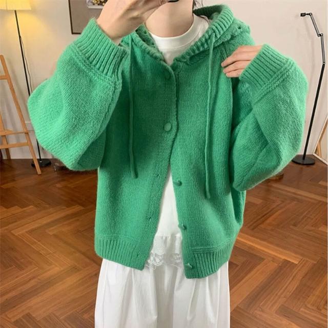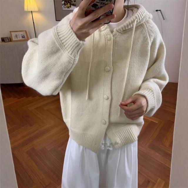 南瓜橘色韓系復古連帽毛衣外套女秋冬寬松慵懶高級感粗線針織開衫