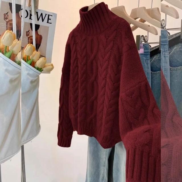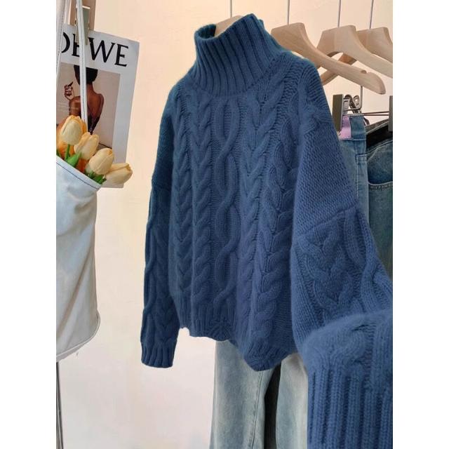 綠色高領麻花毛衣女秋冬加厚高級感寬松慵懶風短款針織衫冬季上衣 322