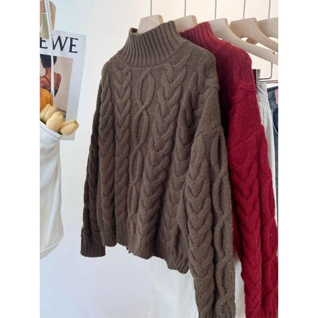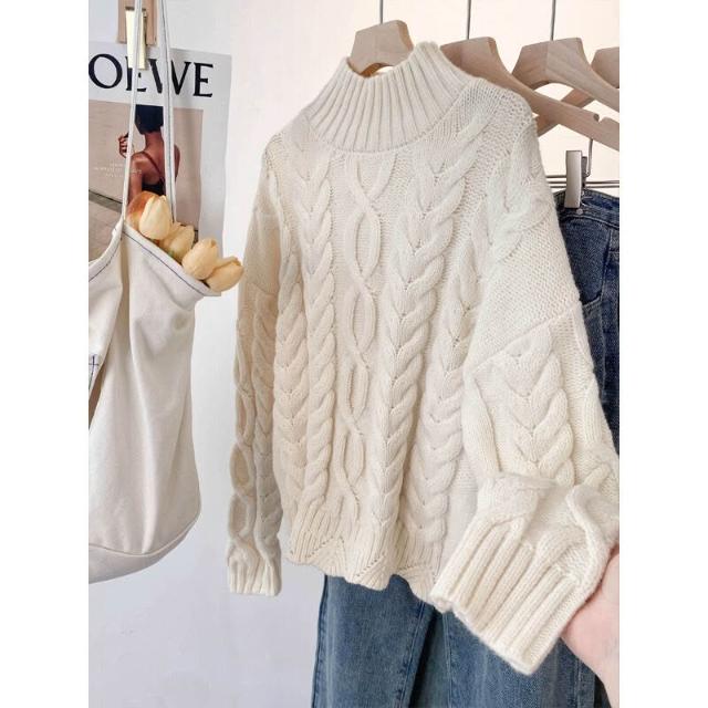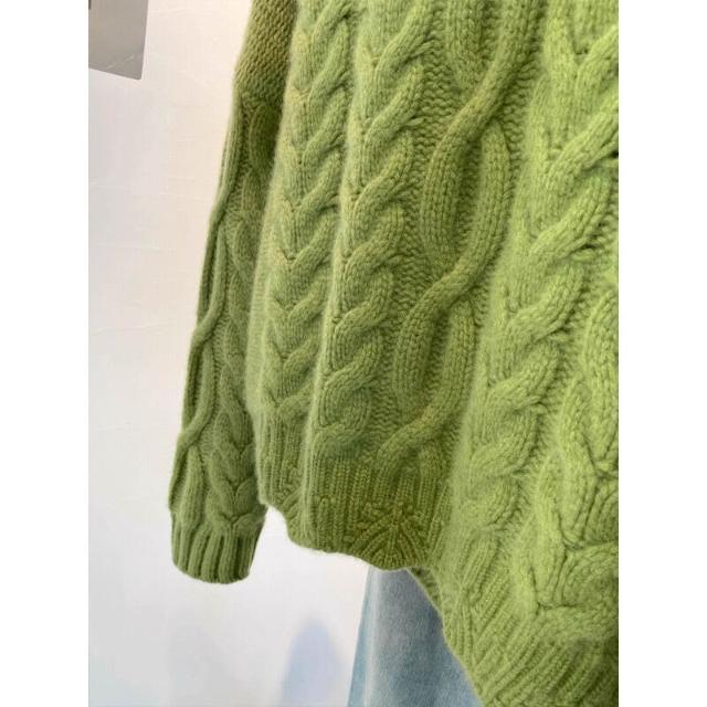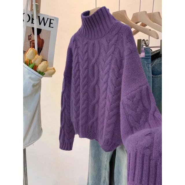 綠色高領麻花毛衣女秋冬加厚高級感寬松慵懶風短款針織衫冬季上衣 322