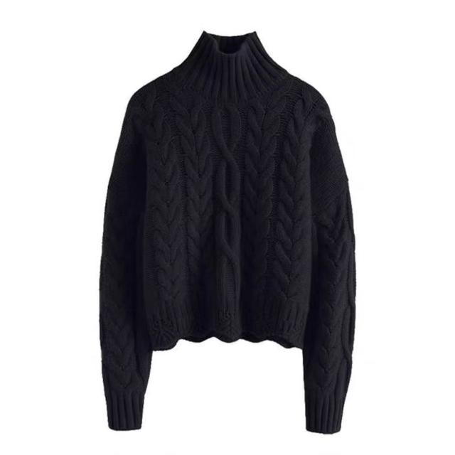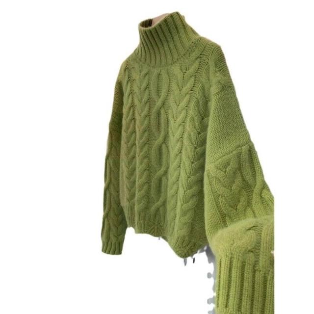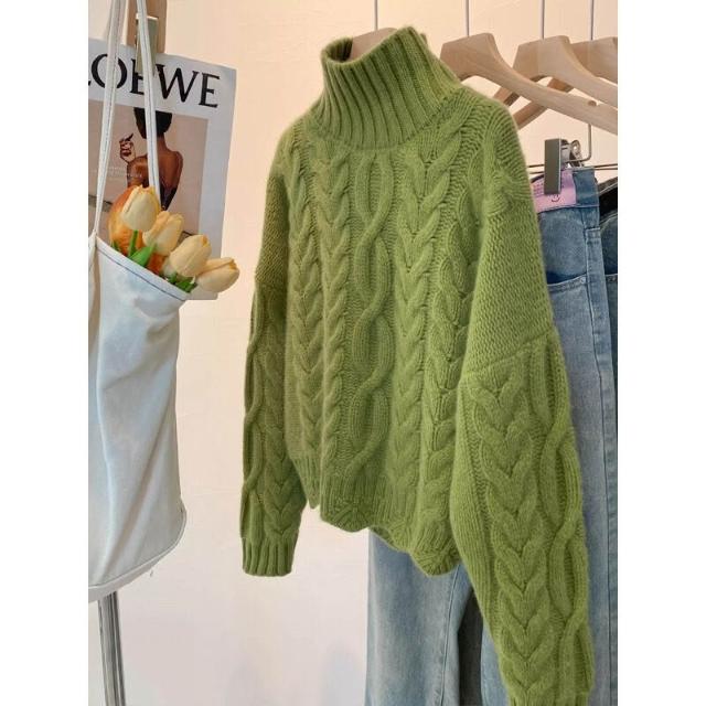 綠色高領麻花毛衣女秋冬加厚高級感寬松慵懶風短款針織衫冬季上衣 322