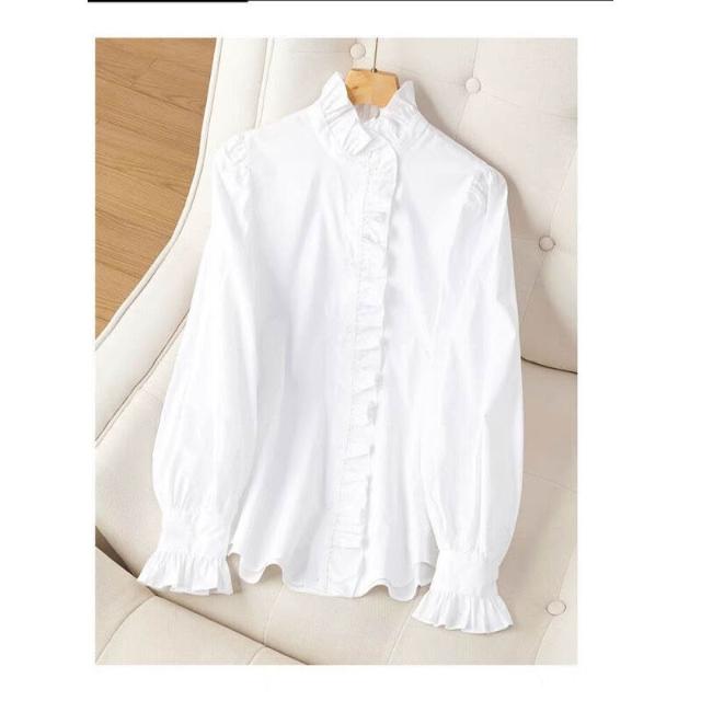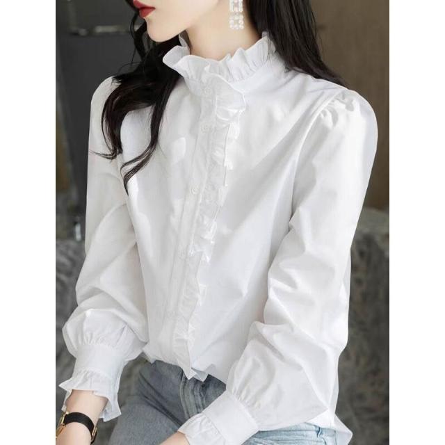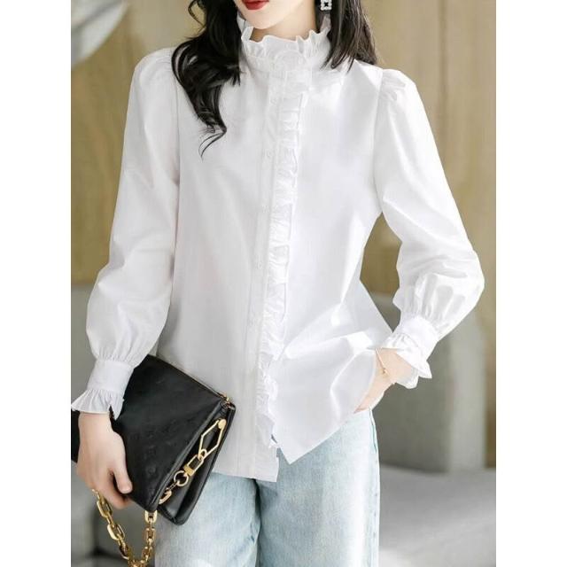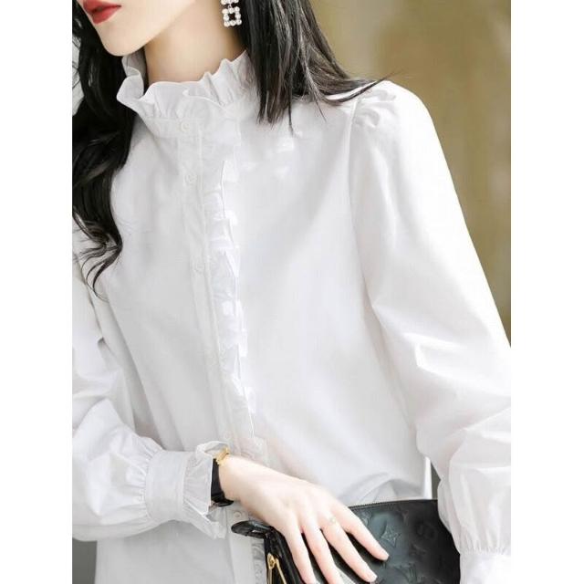 2024年新款春秋白色襯衫女上衣內搭長袖荷葉邊立領純色木耳邊襯衣 a9d